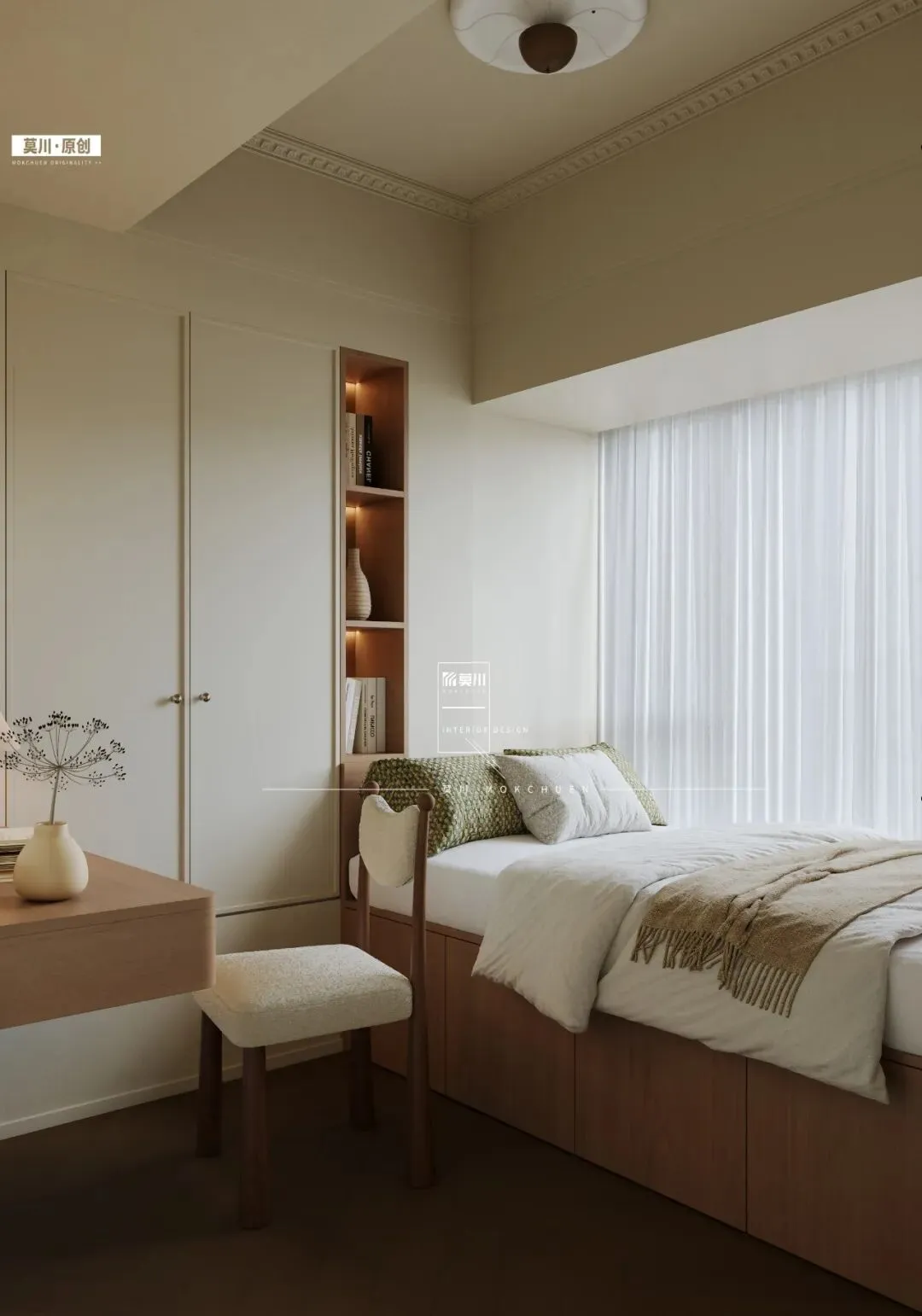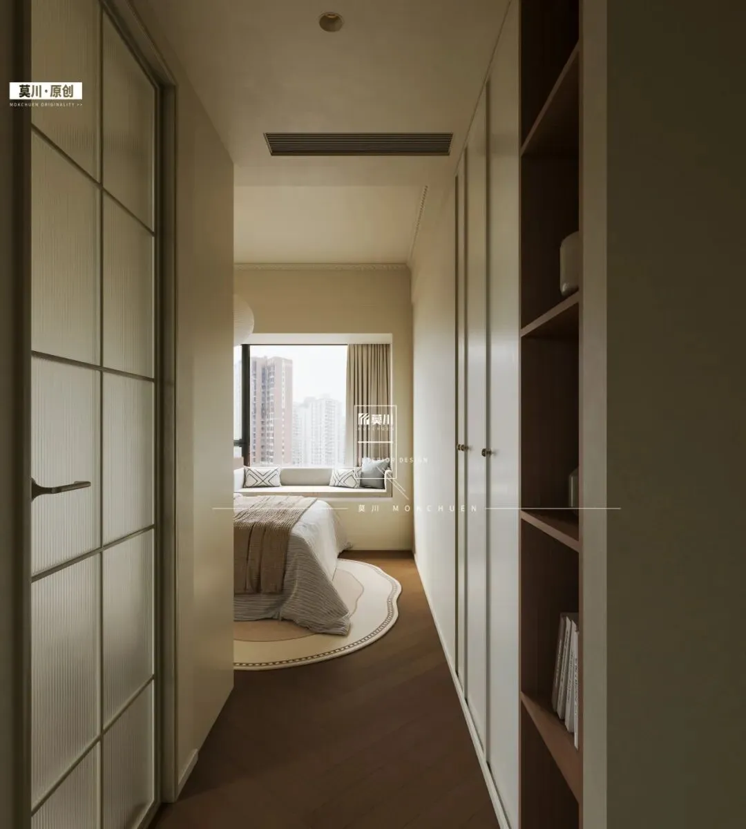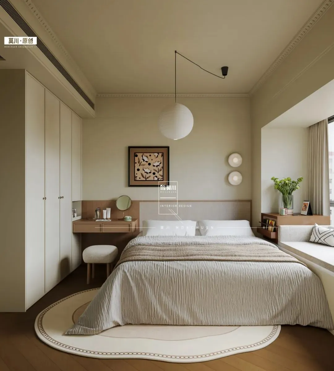 整面墙的通顶米白色衣柜,以简洁的无把手设计呈现,犹如一面洁净的背景墙。它不仅提供了海量储物空间,其柔和的色调与哑光质感,更强化了整体空间的宁静、统一与呼吸感,让人沉浸于舒缓的治愈氛围之中。