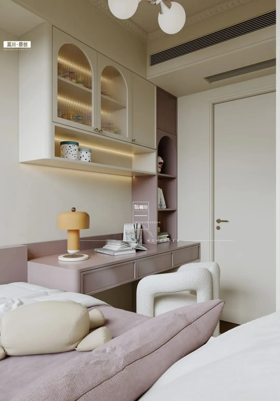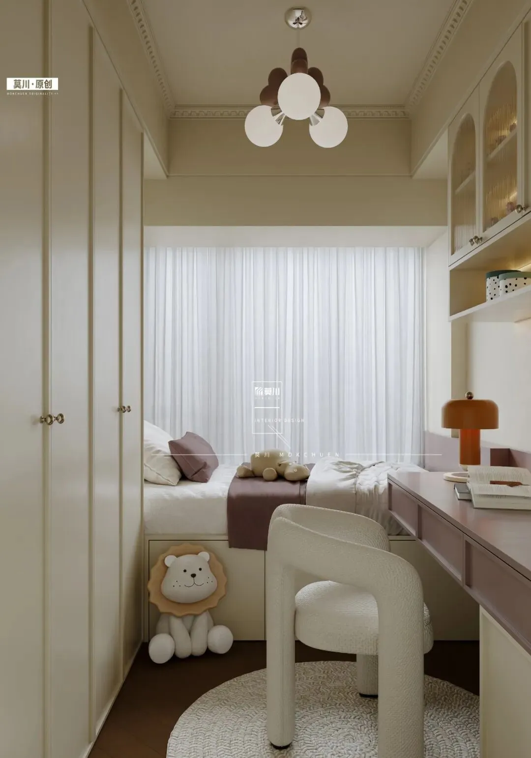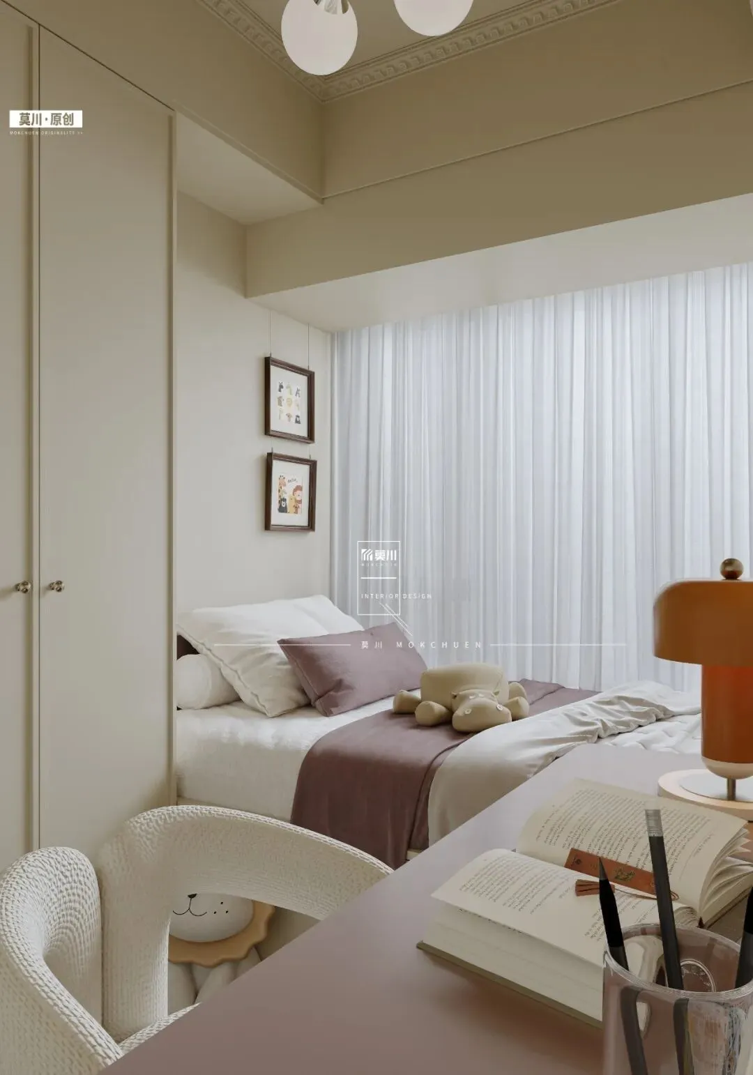 儿童房以纯净的米白为主调,巧妙融入梦幻薰衣草紫作为点睛之笔,营造出温柔而充满想象力的成长空间。