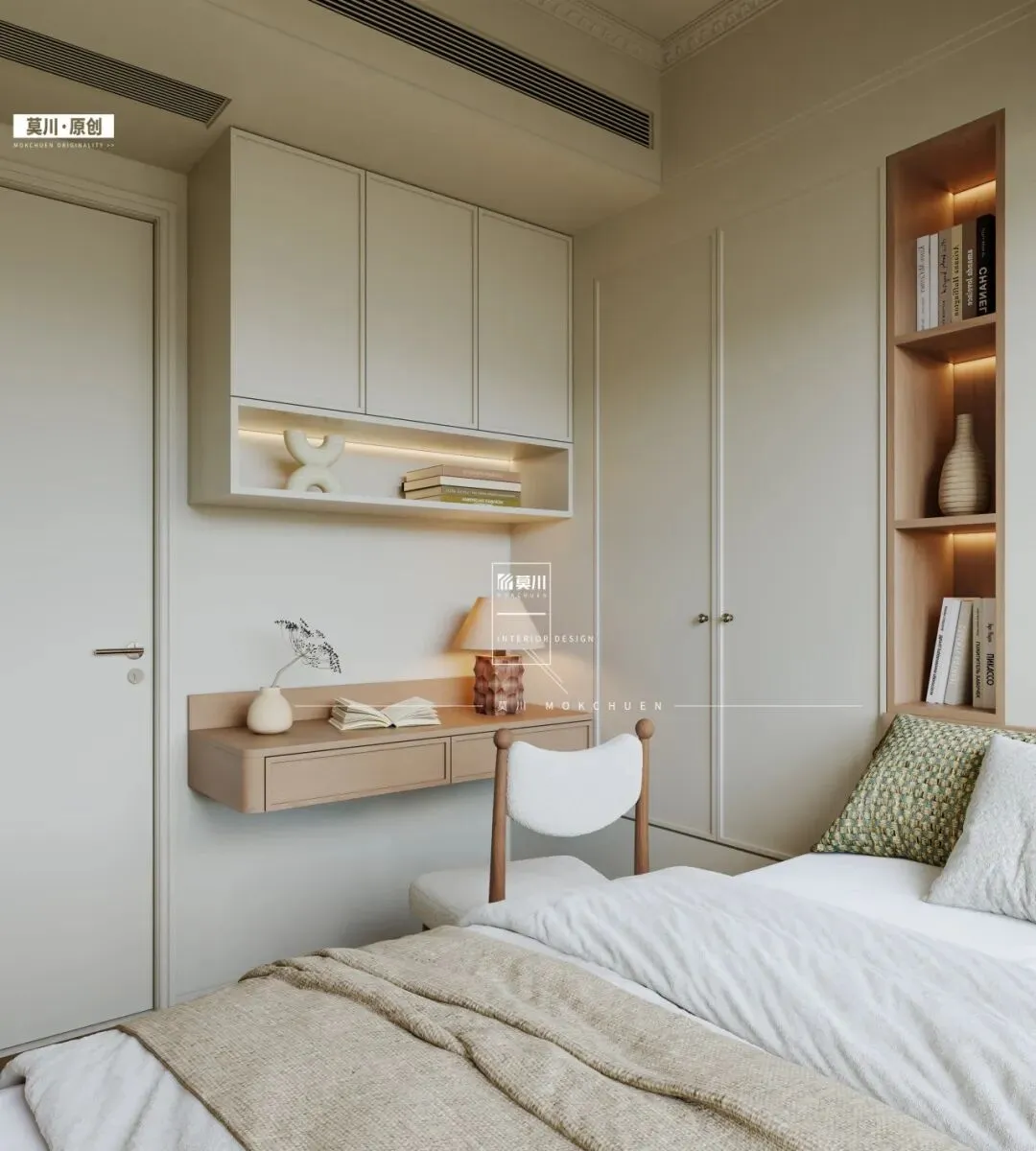 次卧延续整体空间的静谧基调,以米白色贯穿始终,营造出宁静且具扩容感的休憩环境。设计核心在于极致利用空间,实现“麻雀虽小,五脏俱全”的高效布局。