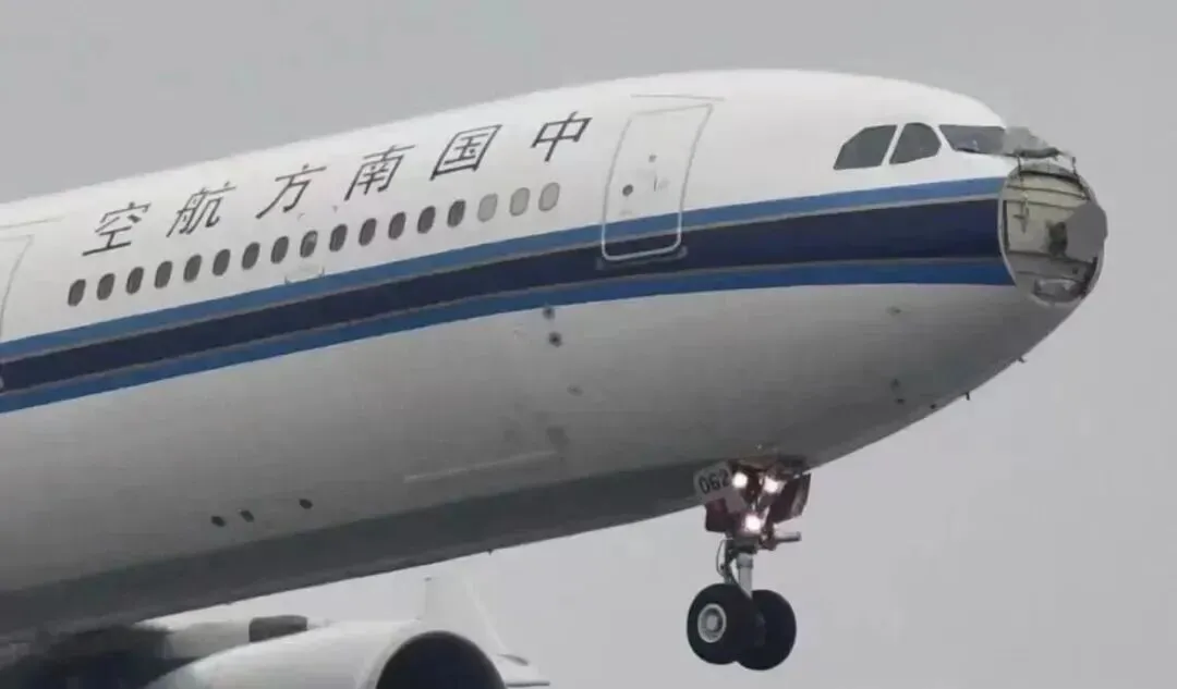 据网友“频闪灯”拍摄的降落图片,整个雷达罩已经脱离,部分残片仍然挂在机头处,被高速气流扬起。