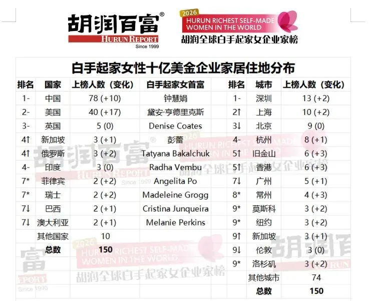 胡润集团董事长兼首席调研官胡润表示,本次榜单共收录20个国家150位白手起家,身价超过十亿美金的女性企业家,中国以78位上榜者领跑全球,占比超五成,而深圳作为中国科创与产业核心城市,成为中国女性创富的标杆代表,上榜人数远超上海(10位)、北京(9位)等城市,旧金山以6位位列第五,是唯一跻身前五的非中国城市。