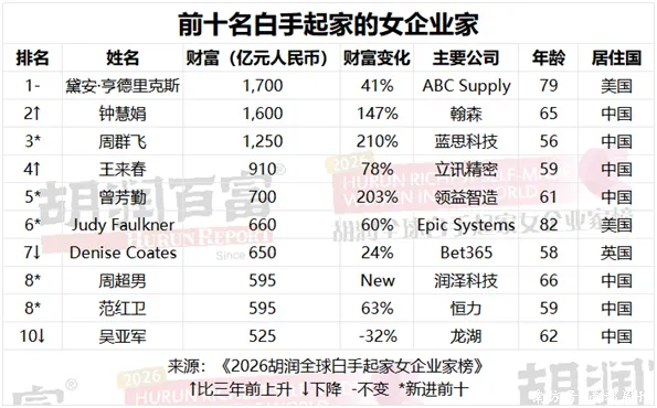 3月17日,胡润研究院发布《2026胡润全球白手起家女企业家榜》,列出全球白手起家的女性十亿美元企业家,财富计算的截止日期为2026年1月15日。