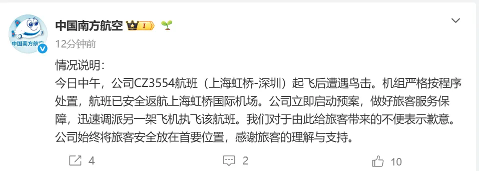 3月21日,中国南方航空发布情况通报:今日中午,公司CZ3554航班(上海虹桥-深圳)起飞后遭遇鸟击。机组严格按程序处置,航班已安全返航上海虹桥国际机场。公司立即启动预案,做好旅客服务保障,迅速调派另一架飞机执飞该航班。我们对于由此给旅客带来的不便表示歉意。公司始终将旅客安全放在首要位置,感谢旅客的理解与支持。