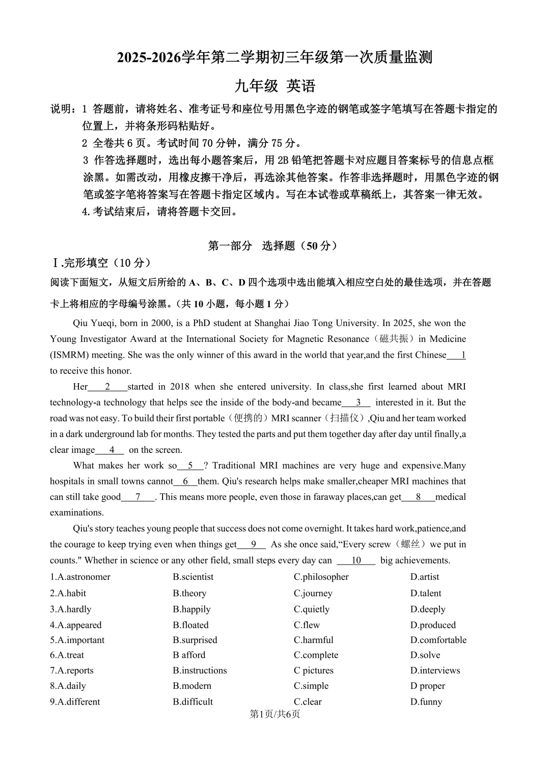 2026年3月深圳市蛇口育才教育集团初三一模英语试卷+答案
