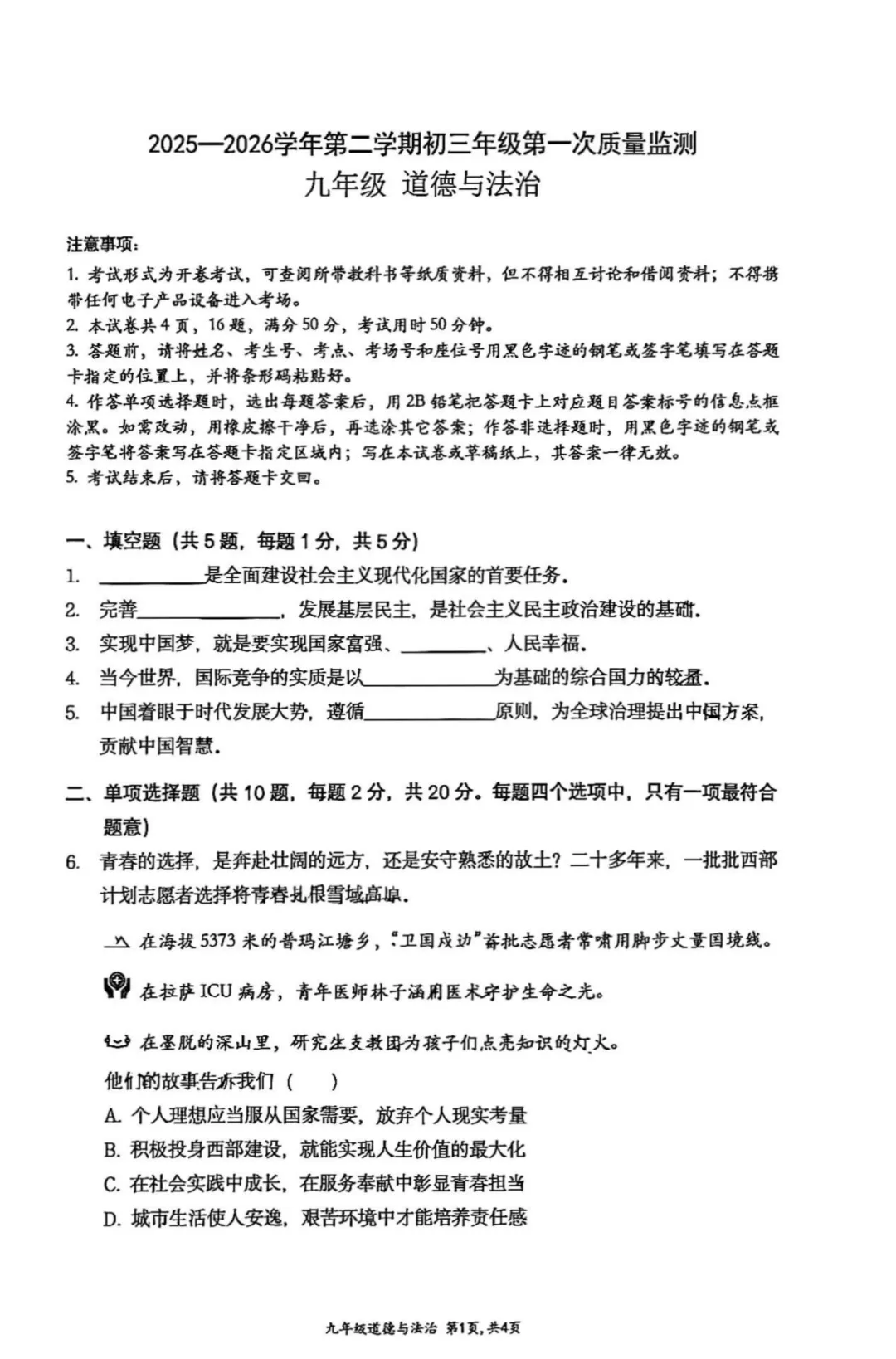 2026年3月深圳市蛇口育才教育集团初三一模道法试卷+答案