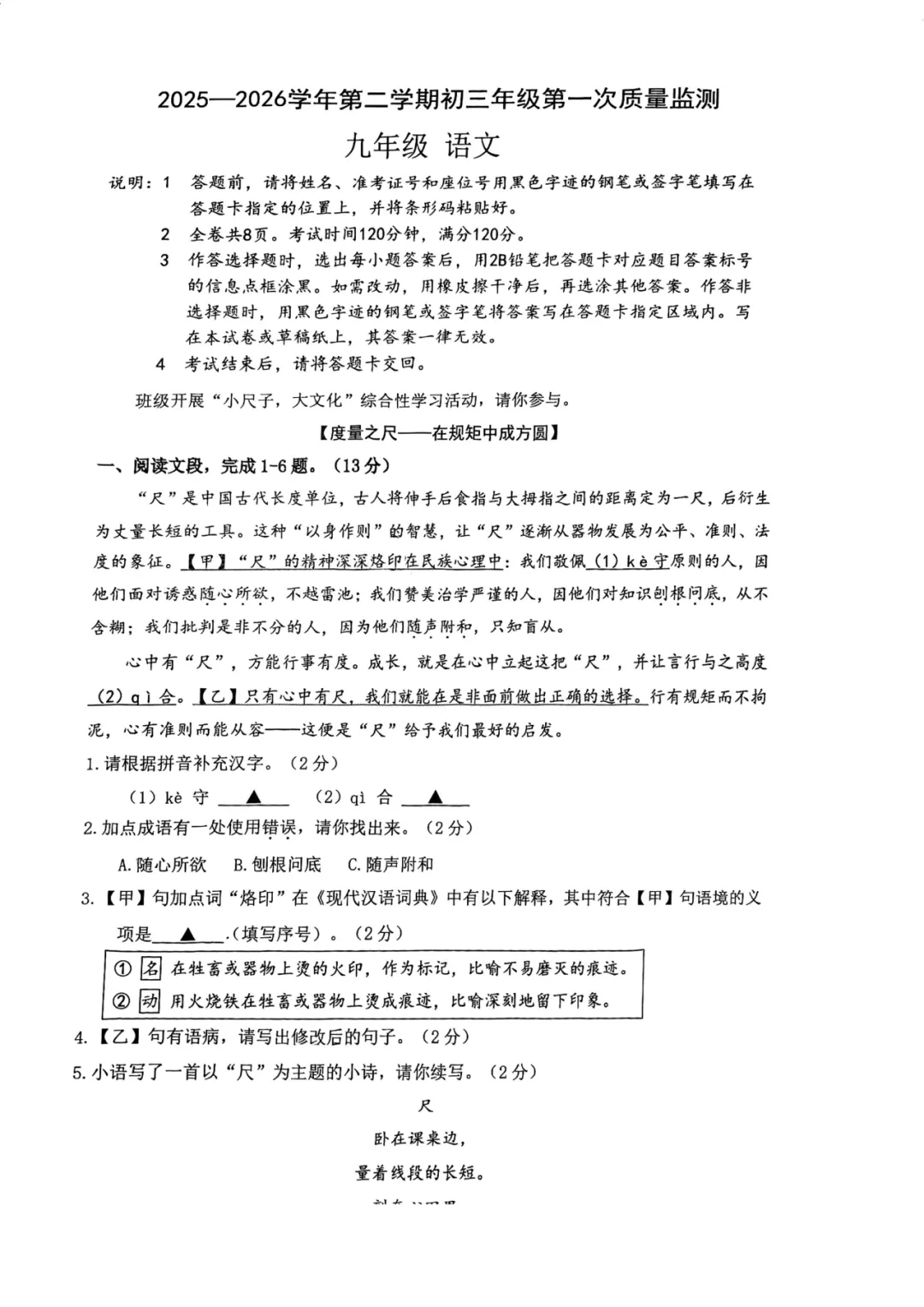 2026年3月深圳市蛇口育才教育集团初三一模语文试卷+答案