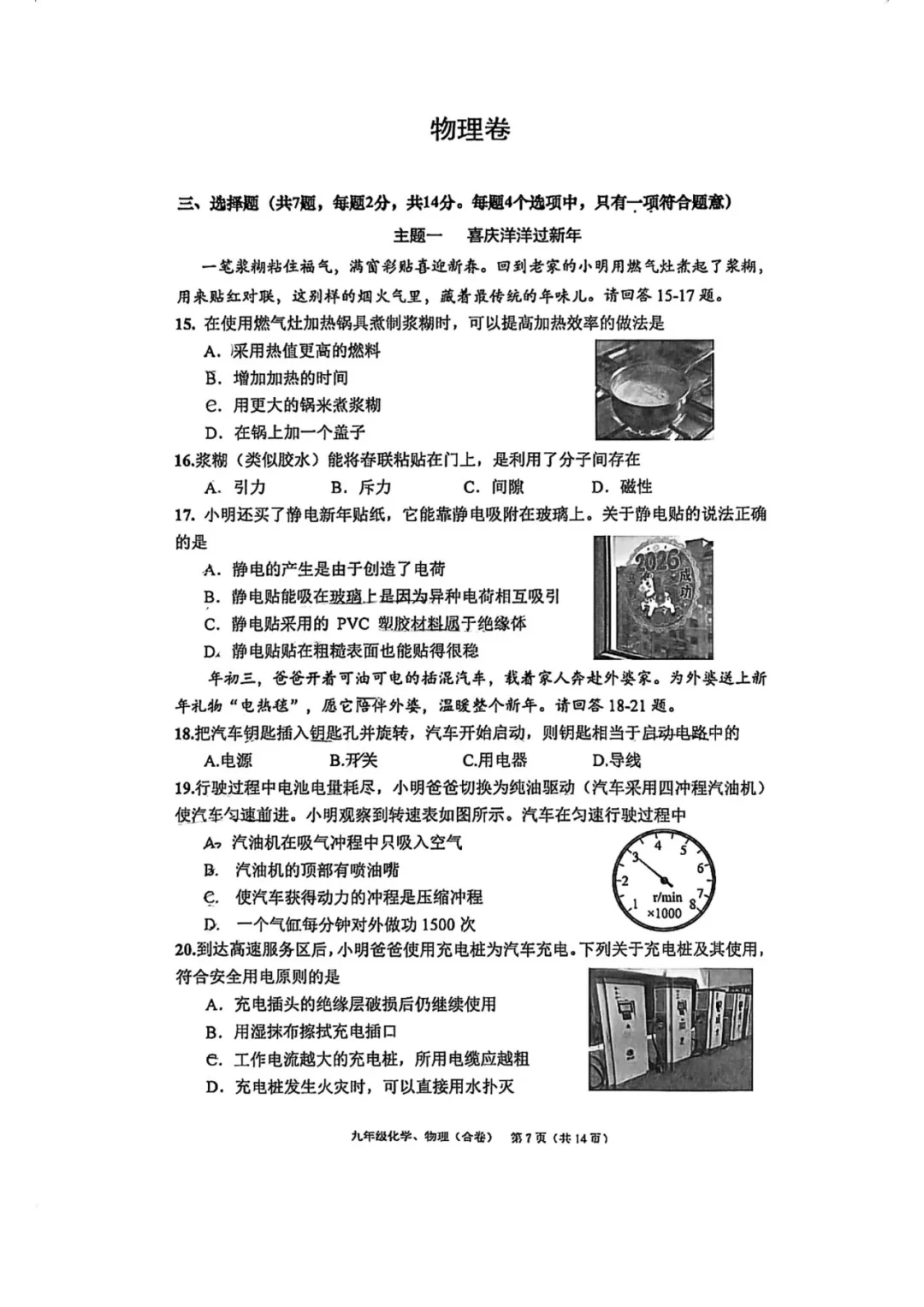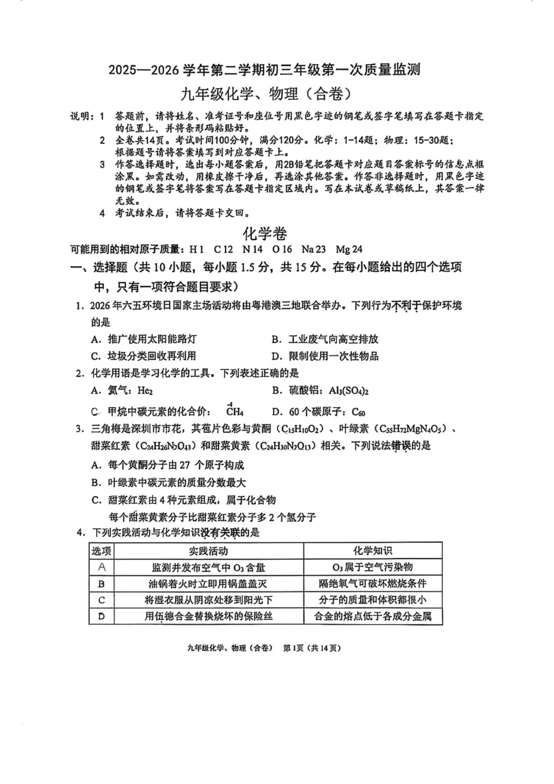 2026年3月深圳市蛇口育才教育集团初三一模化学物理合卷+答案