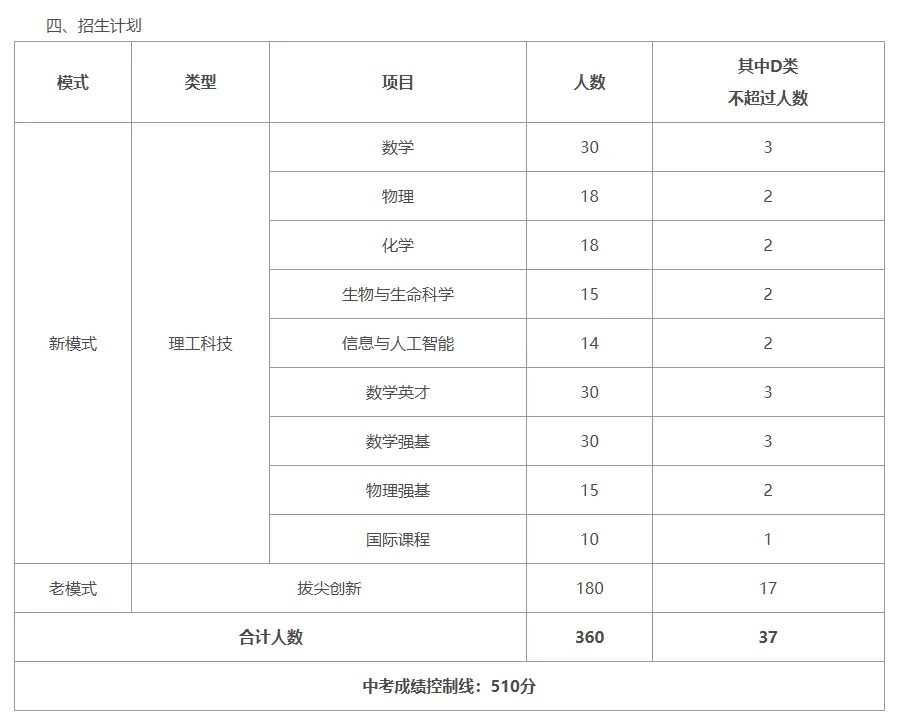 深圳市高级中学中心校区2025年自主招生设置了拔尖创新和理工科技两大类,其中理工科技进一步细分为信息、化学、数学、物理四个专项。从拟录取公示来看,各专项录取标准明确,AC类考生拔尖创新专项合成分高达91.31分,理工科技类各专项也均在76分以上,D类考生竞争更为激烈,最高达91.57分 。