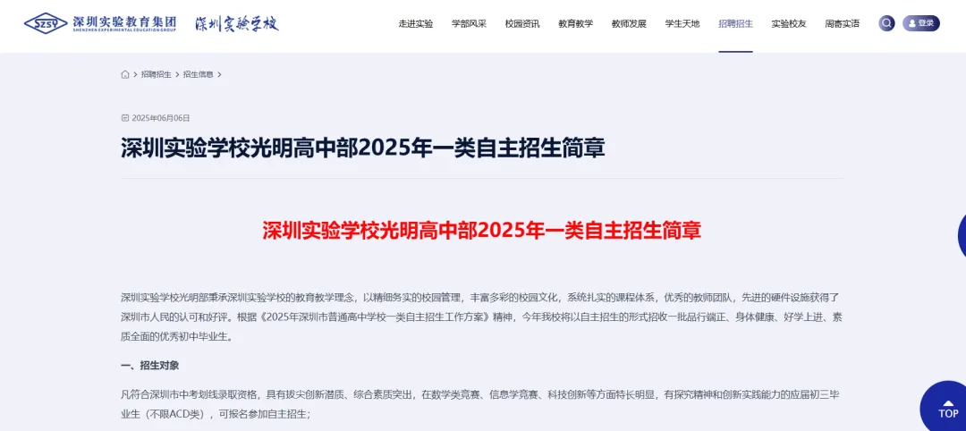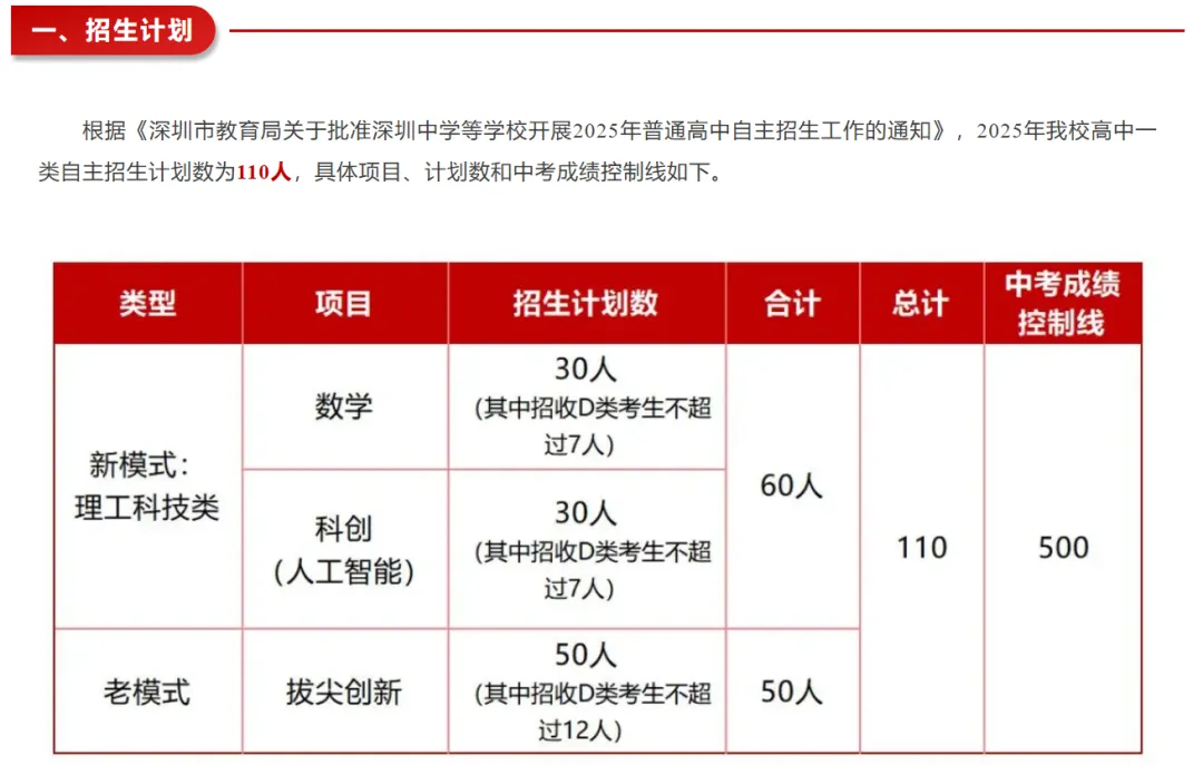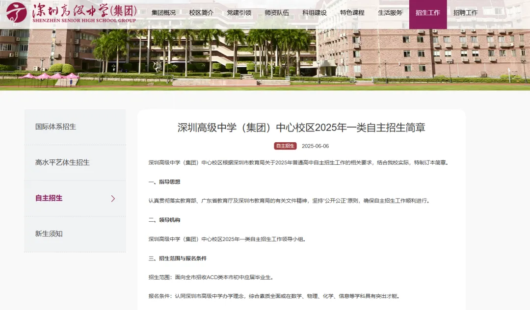 根据深圳市教育局的统一部署,2025年公办普通高中一类自主招生继续坚持“育人为本、科学规范、公平公正”的原则,学校考核于7月5日进行,录取权重仍为中考成绩占60%、学校专项考核成绩占40% 。