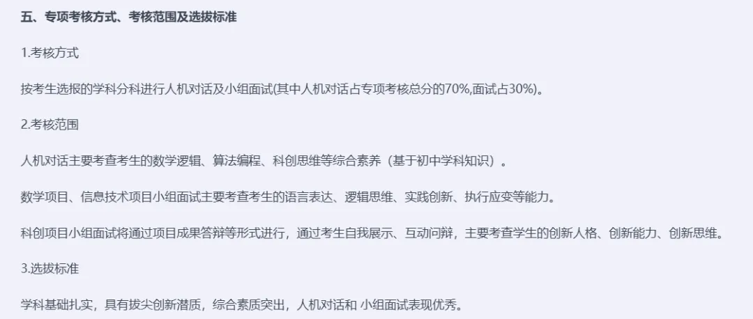 考核方式采用人机对话占70%、小组面试占30%的组合。值得注意的是,科创项目的面试将通过项目成果答辩形式进行,重点考察学生的创新人格、创新能力和创新思维,对真正有科创实践经历的学生极为有利 。