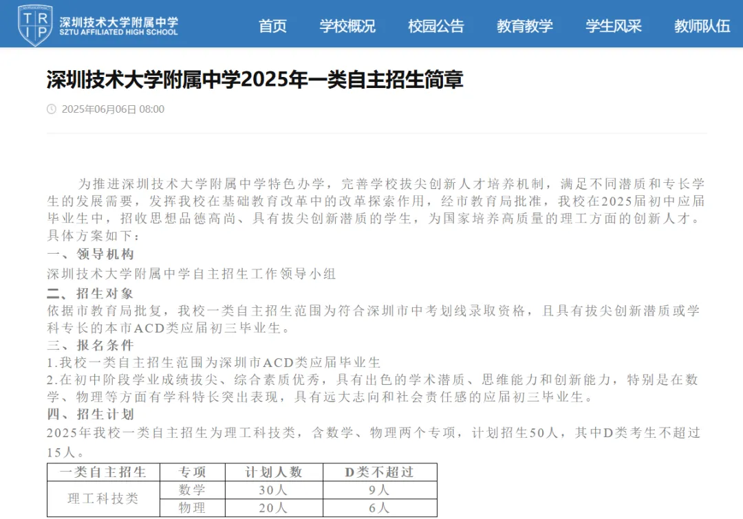 作为依托深圳技术大学办学资源的附属中学,该校2025年一类自主招生全部为理工科技类,设数学30人、物理20人,共50人 。考核方式为人机对话加无领导小组面试,注重考查学生的学术潜质和思维能力。对于在数学、物理方面有突出特长的学生,这里是理想的升学选择。