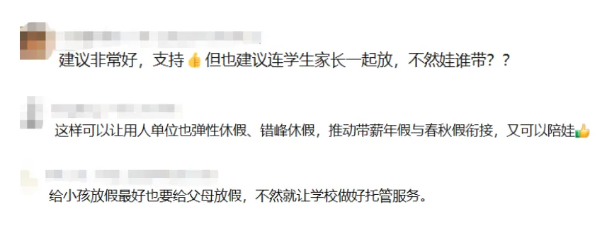 在“连休6天”话题冲上热搜时,“春假清明连休6天家长称很无奈”等话题的讨论度也在飙升,不少家长表示学生放春秋假的时候家长并不放假,实际效果可能会大打折扣。