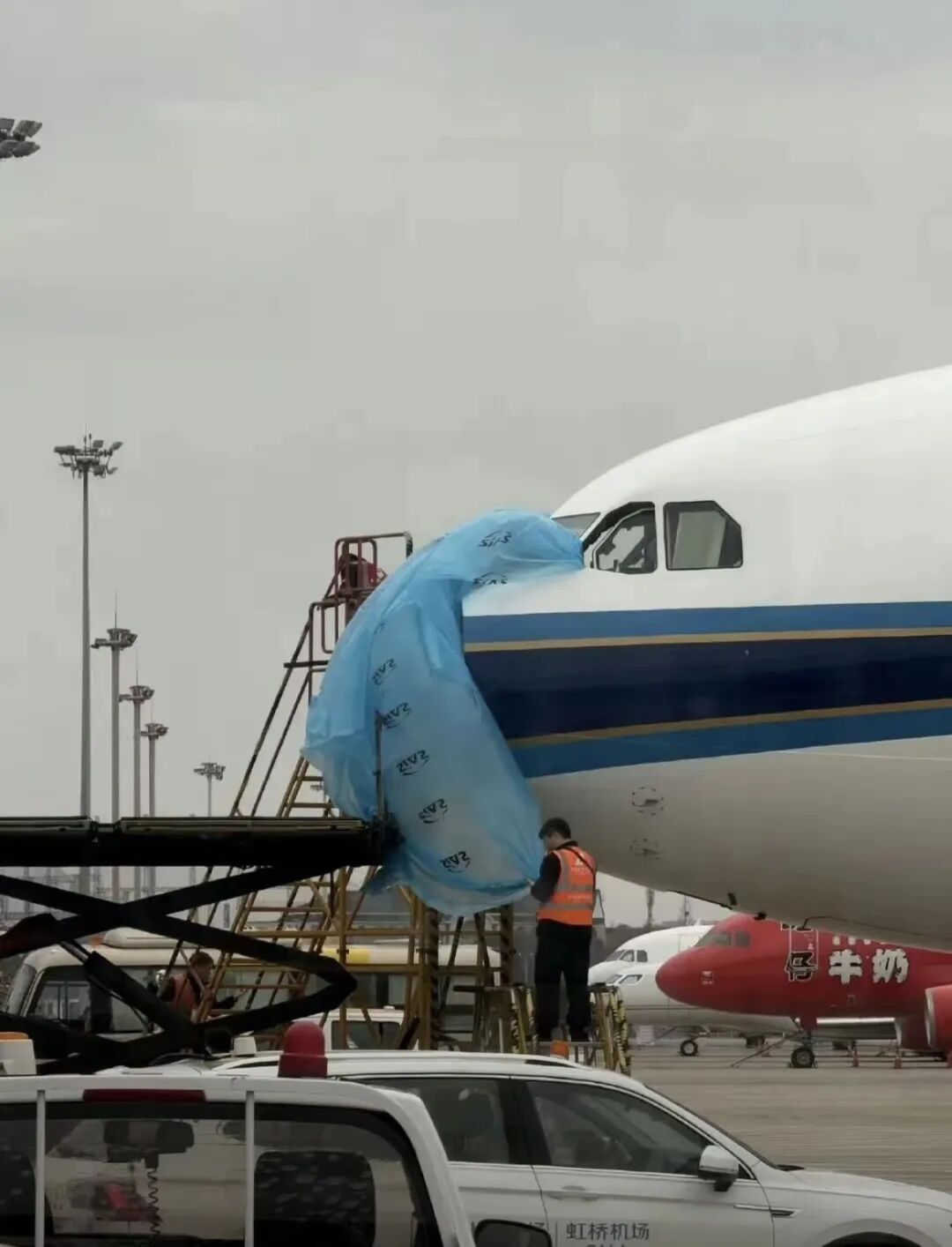 据网友“120°E,28°N”图片,在机坪上,南航机务人员用塑料布,将裸露的雷达天线包裹起来。