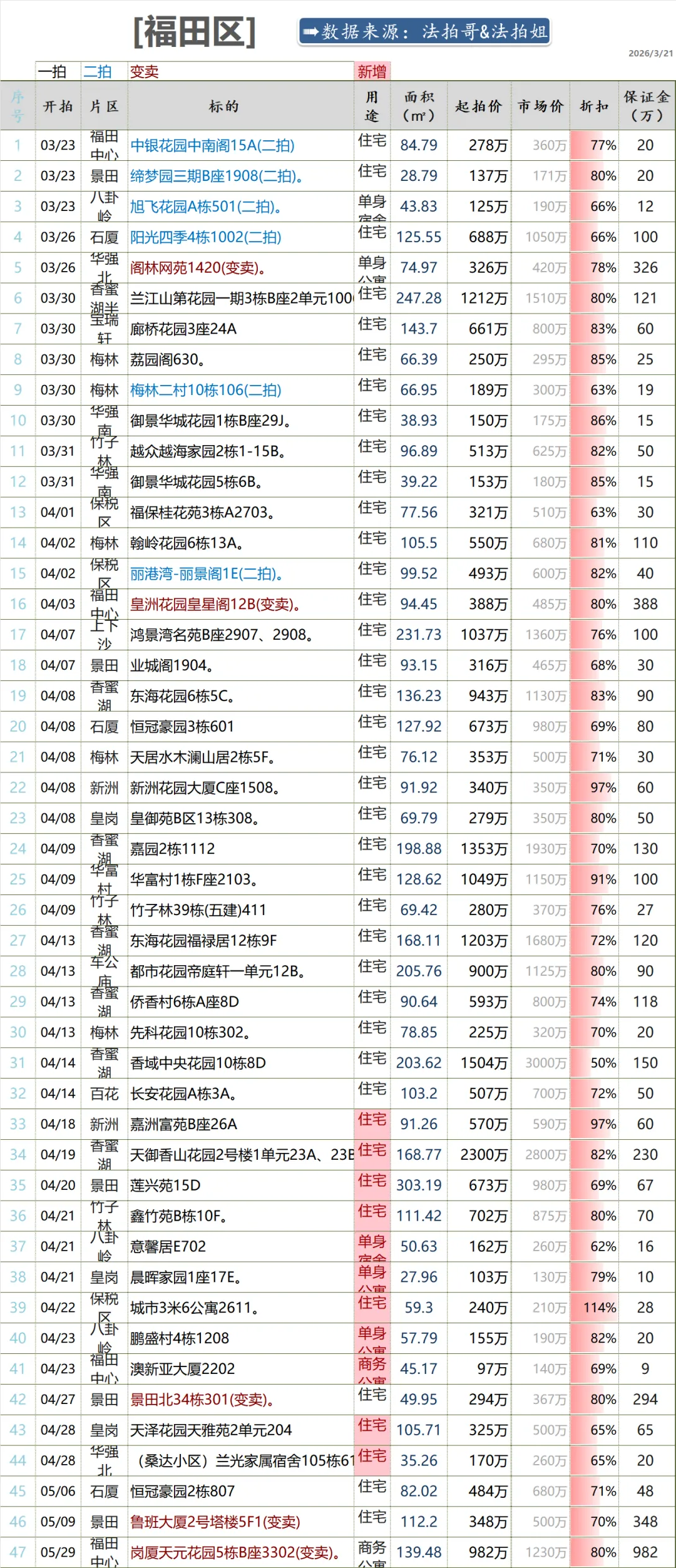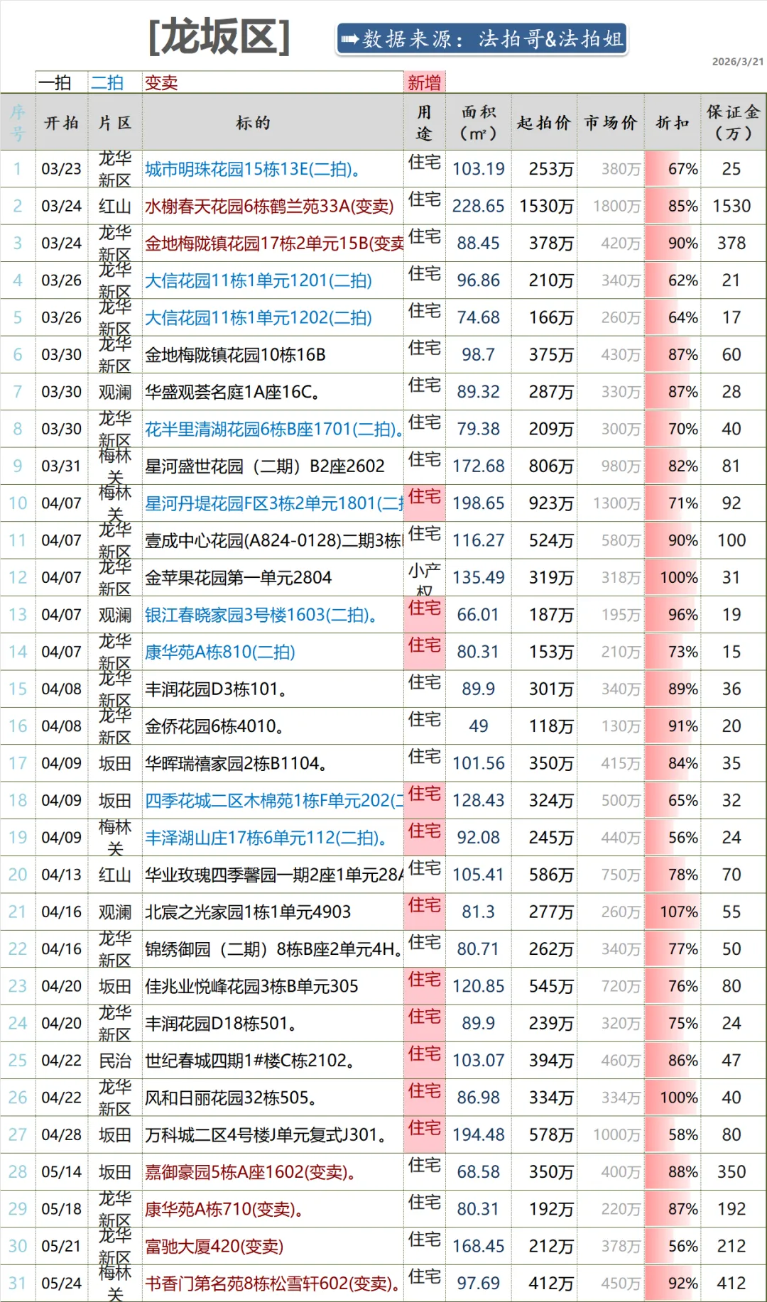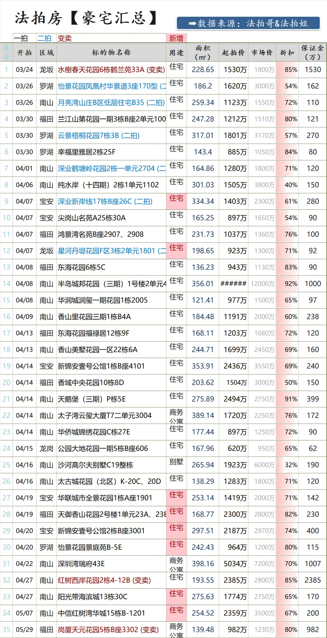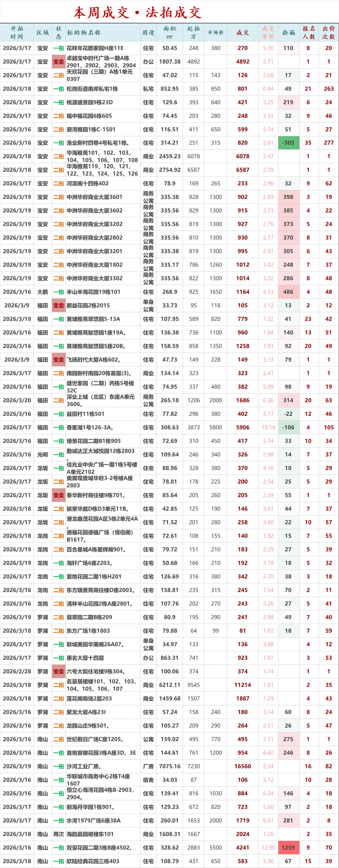 深圳市法拍房(拍卖房)本周成交汇总一览表