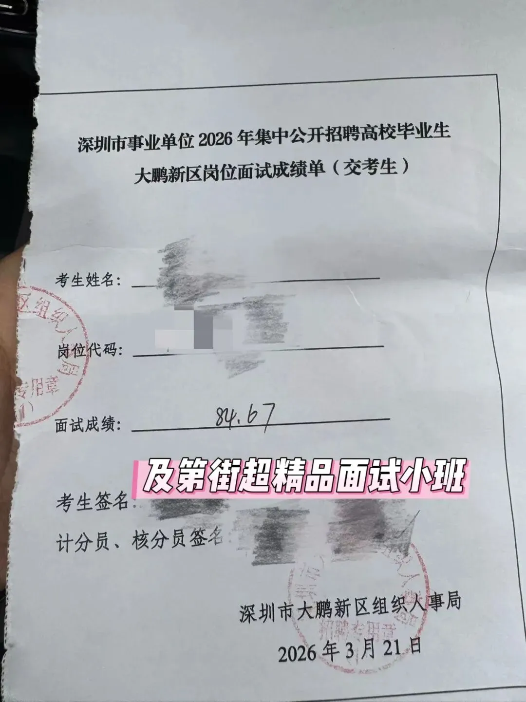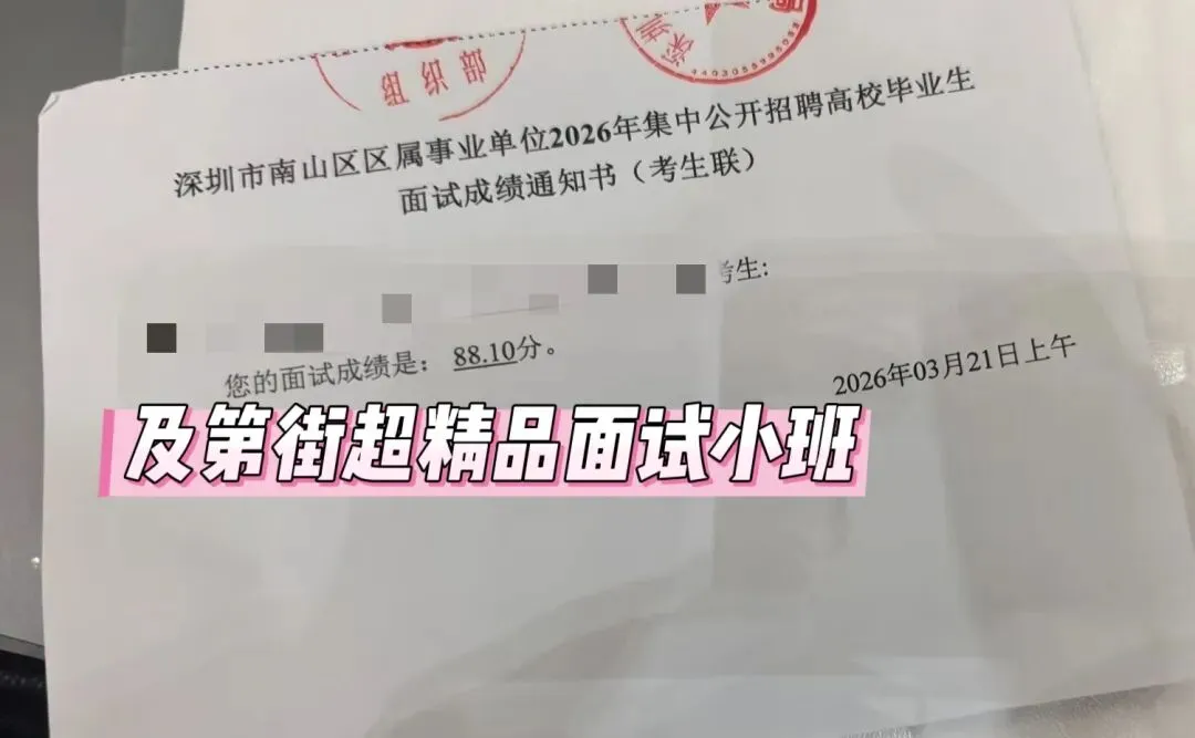 3月21日上午,南山事业单位面试中,及第街学员上场即高分,取得88+的优异成绩。第一题综合分析,关注“预约制”这一社会热点。在近期学员课堂练习中使用的预测题目中有关注,场内惊叹“好眼熟”!