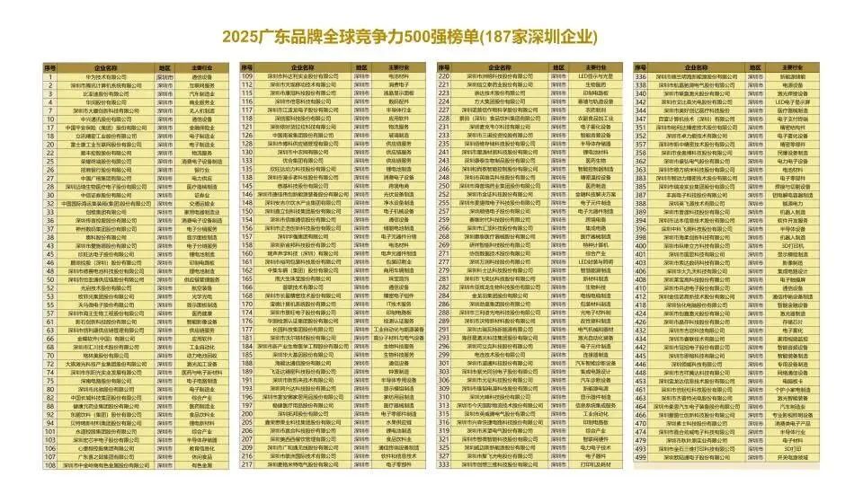 报告显示,2025广东品牌全球竞争力500强榜单中,深圳以187家企业上榜位居全省首位,占比超37%,总数位居全省第一。华为强势登顶榜首,腾讯、比亚迪、大疆、中兴等企业跻身前列,在全球产业链中拥有重要话语权。