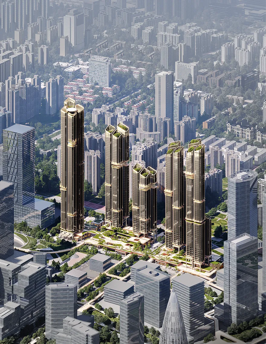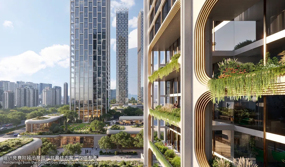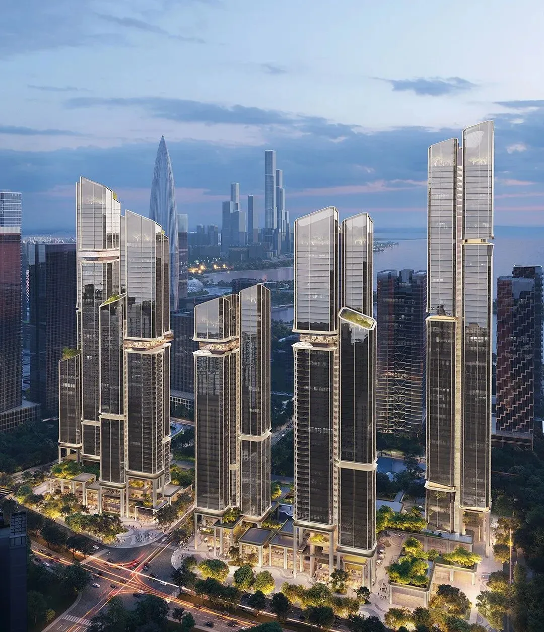 项目由五座150-250米塔楼组成,采用错落布局和平面退台设计,以优化深圳湾景观视野。