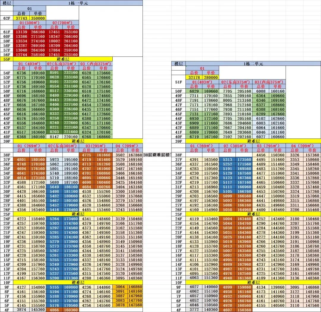 北区1栋、2栋,共约348套,分高低区设计: 低区(5层起,150米内):约209-304㎡四房以上大户型。 高区(42层起,150-200米):约370-403㎡ 4+1房五卫,带家庭厅及家政套间。 超高区(58层起,200米以上):约500-700㎡顶级大平层。 顶楼:约1050㎡整层大平层(仅3套)。低区豪宅入门 (5F-42F,约150米以内)