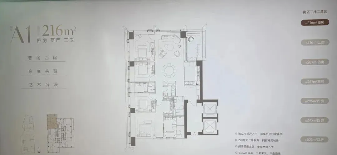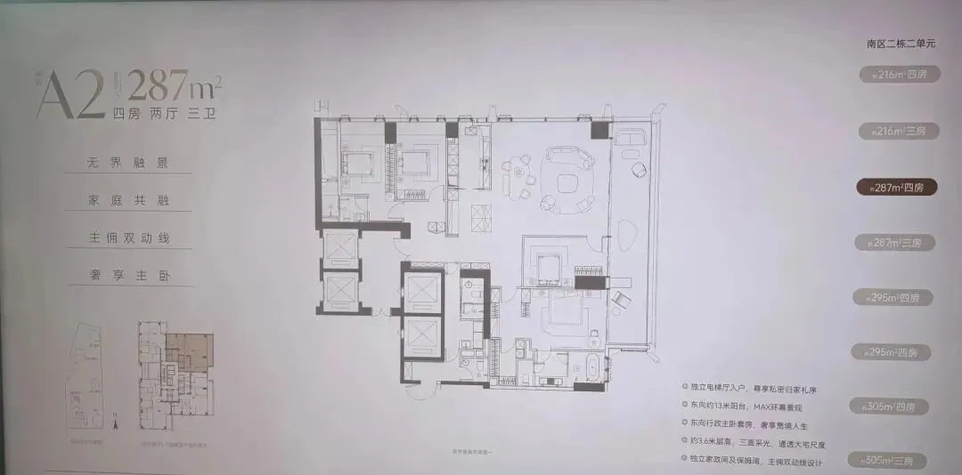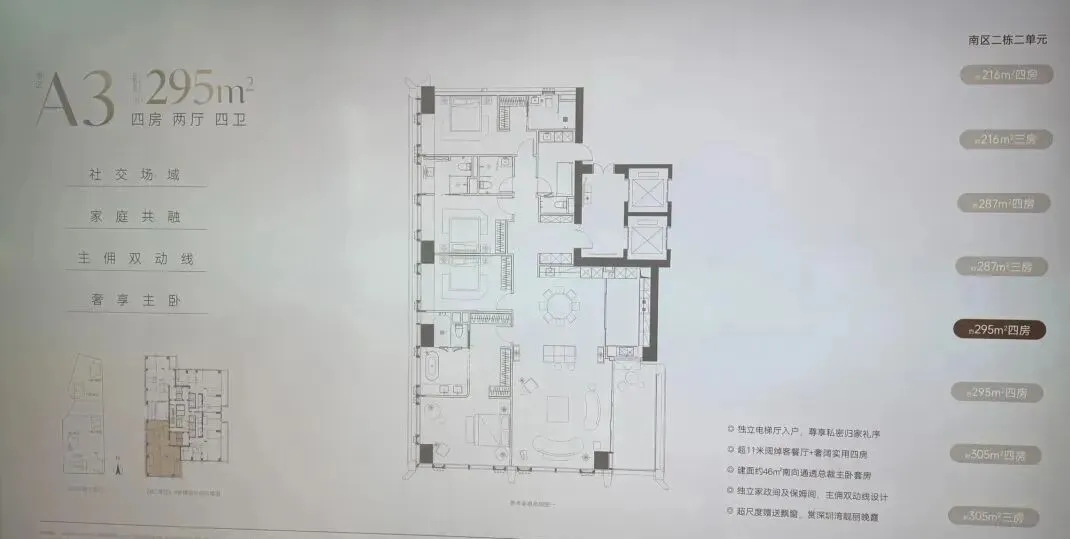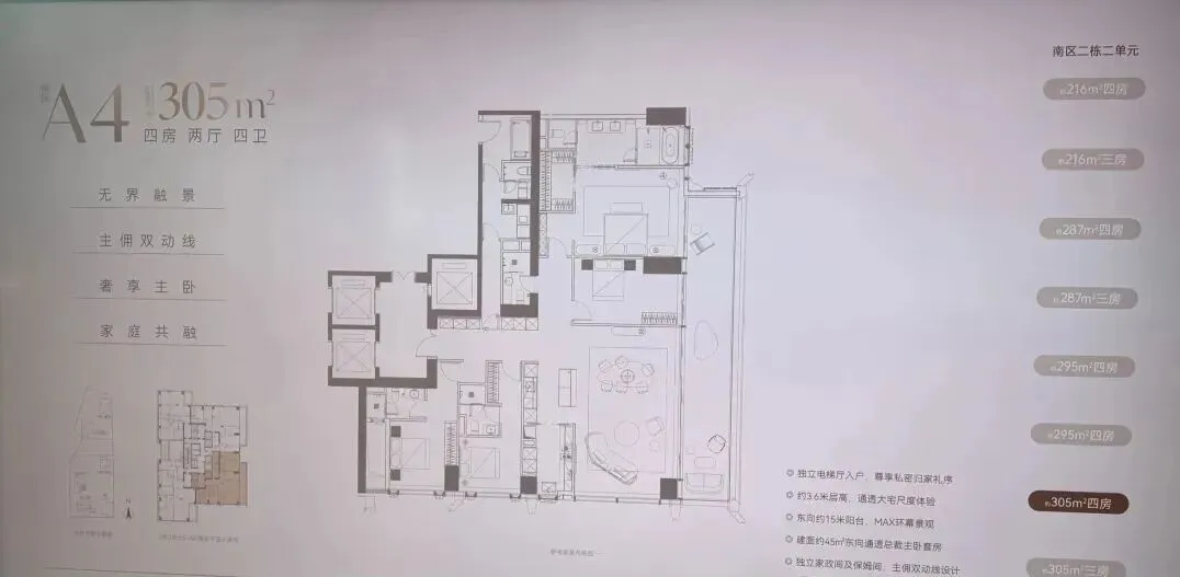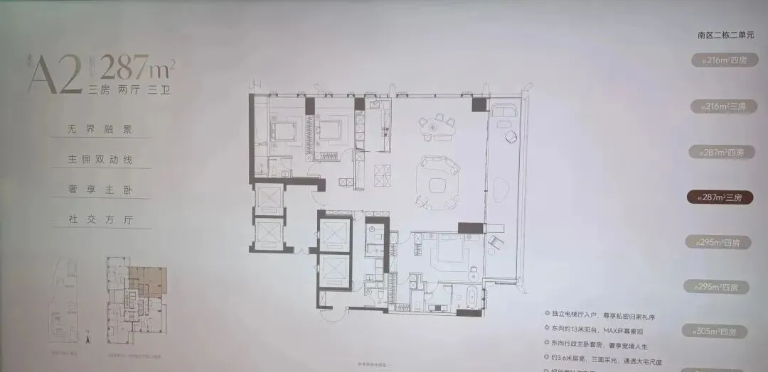 南区2-2栋全面调整,和北区不一样,调整成了低区216-287-295-305㎡,高区重做成了345-409-430㎡。想深度了解各户型优劣,可预约现场了解!