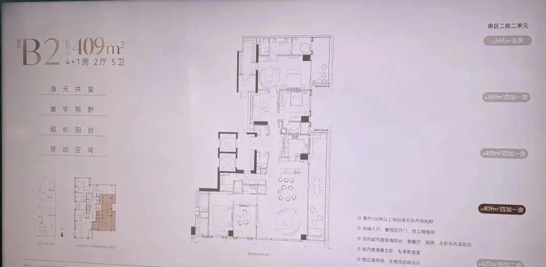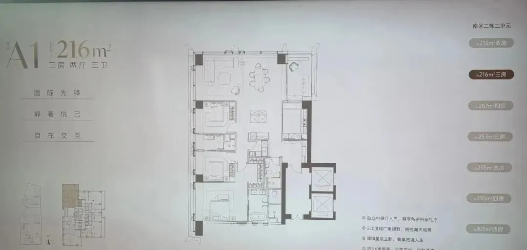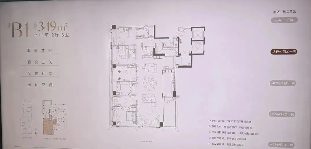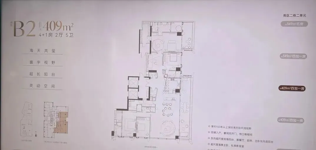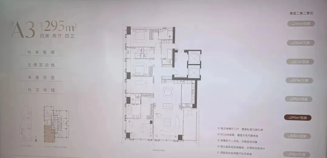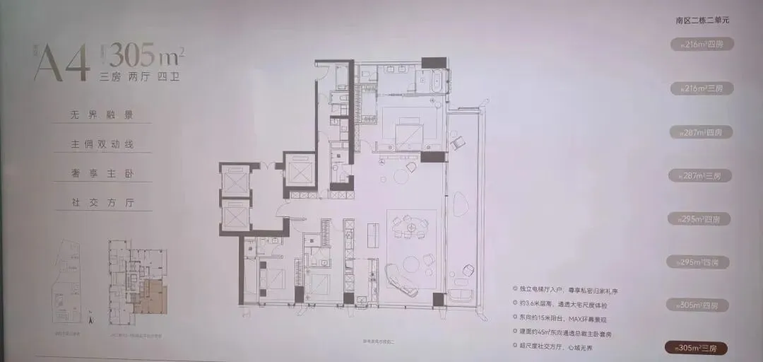 南区2-2栋全面调整,和北区不一样,调整成了低区216-287-295-305㎡,高区重做成了345-409-430㎡。想深度了解各户型优劣,可预约现场了解!