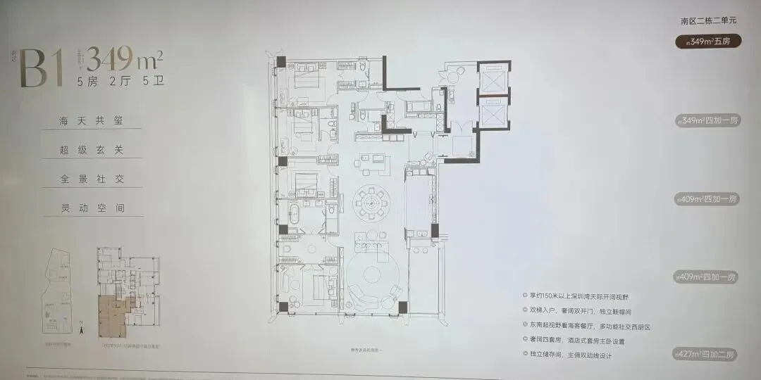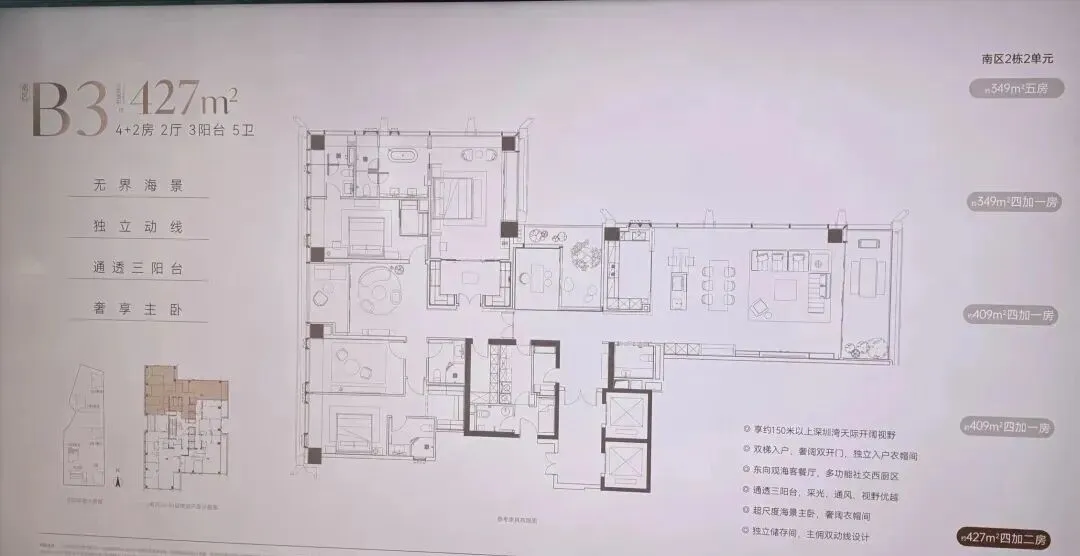 · 500-700㎡户型: 顶级大平层设计,拥有无遮挡的深圳湾景观视野,提供总统级居住体验。