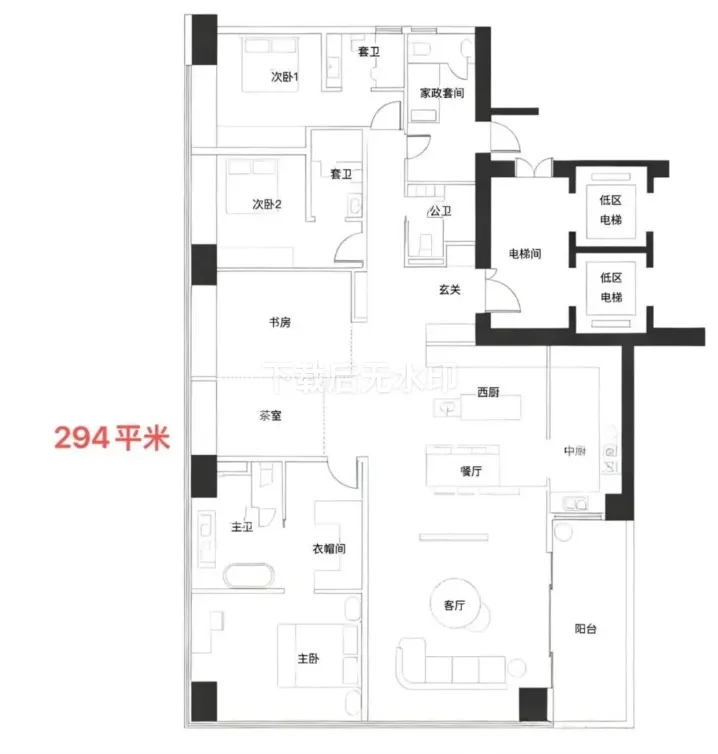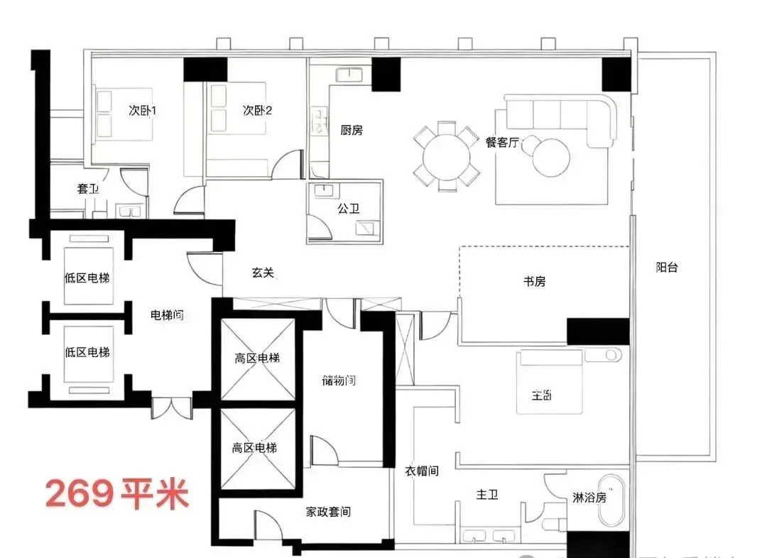 · 269-294㎡户型: 通常是四房以上大户型,注重家庭互动空间与个人私密空间的结合。