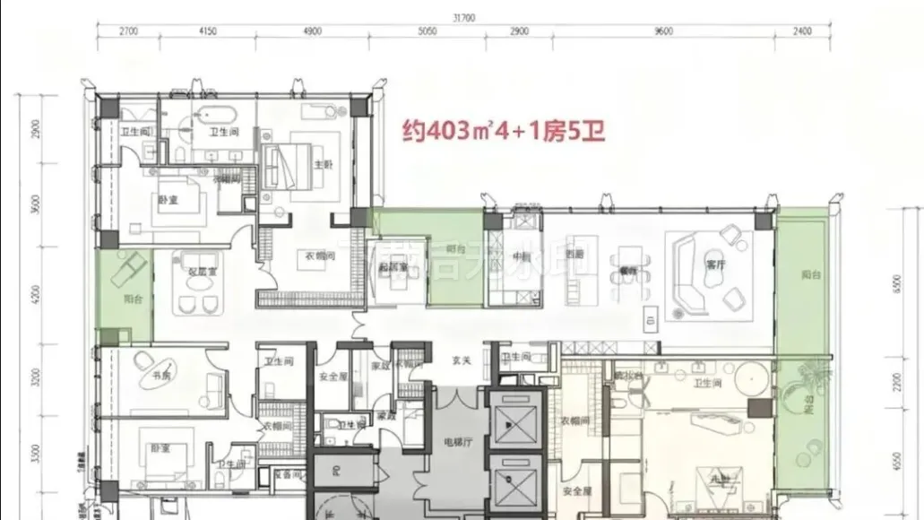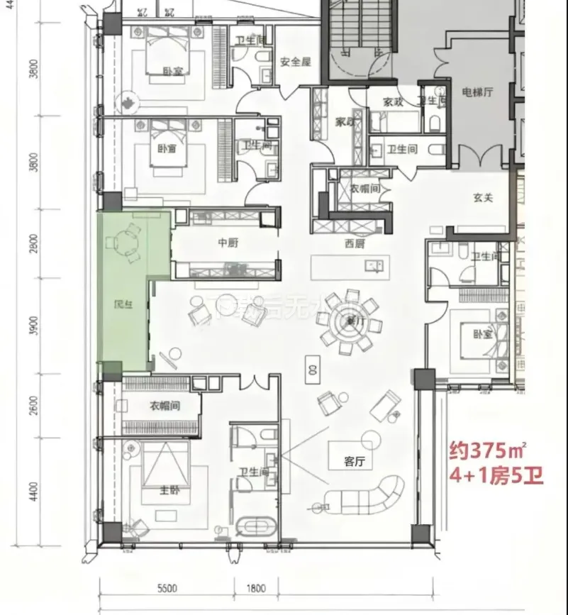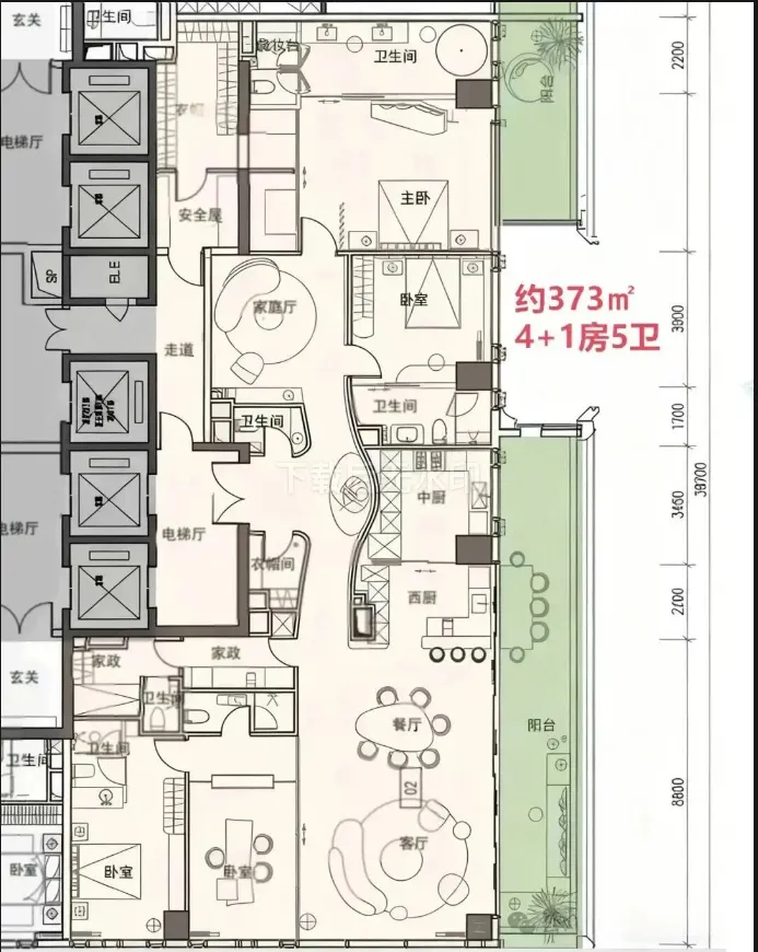 · 370-375㎡户型: 4+1房五卫设计,配备家庭厅和家政套间,适合有多样化生活需求的高净值家庭。