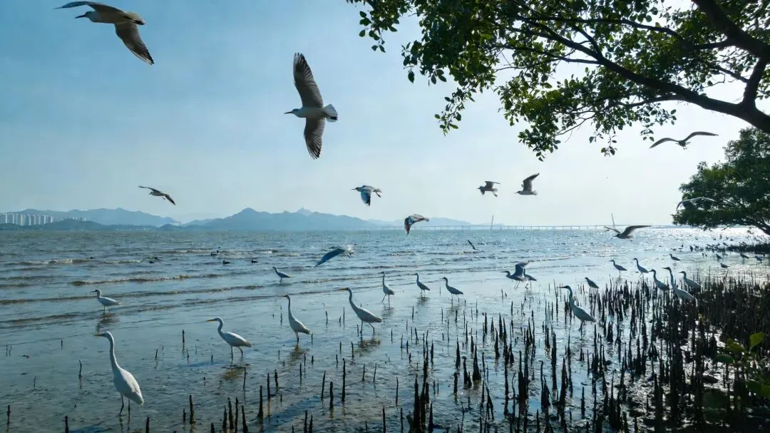 mangrove wetlands hide the traces of migratory birds.红树林湿地藏着候鸟的踪迹,