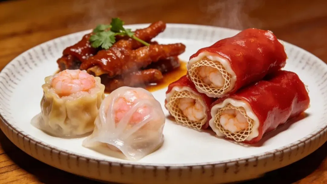 Shrimp dumplings, steamed chicken feet, red rice rolls, soft, glutinous and delicious. 虾饺皇、蒸凤爪、红米肠,软糯鲜香。