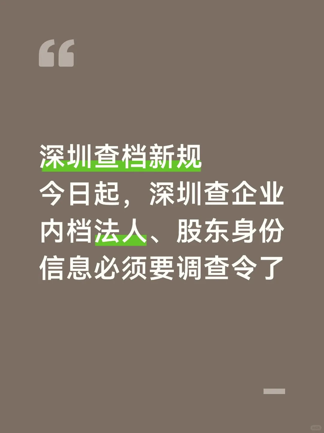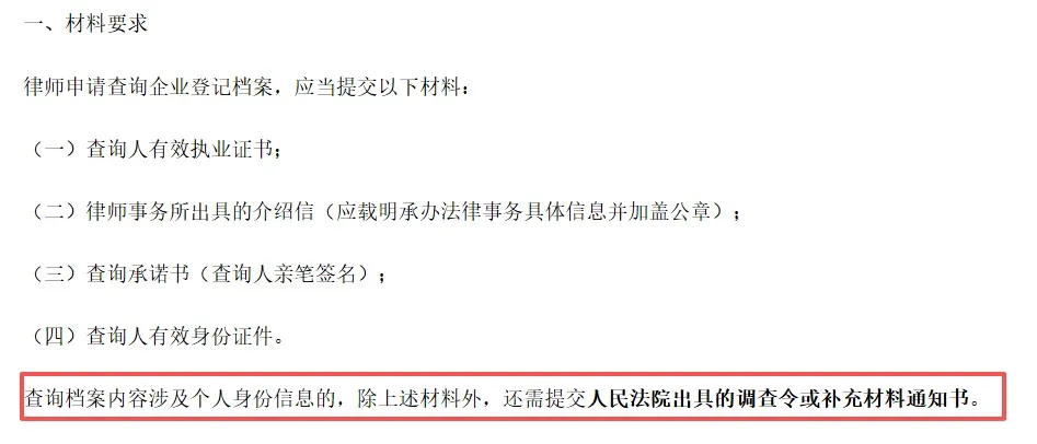 导读:2026年3月19日,深圳市监局发布公告:3月20日起,查询企业内档时,内容涉及法定代表人、股东等个人身份信息的,除此前的材料外,还需提交人民法院出具的【调查令或补充材料通知书】。