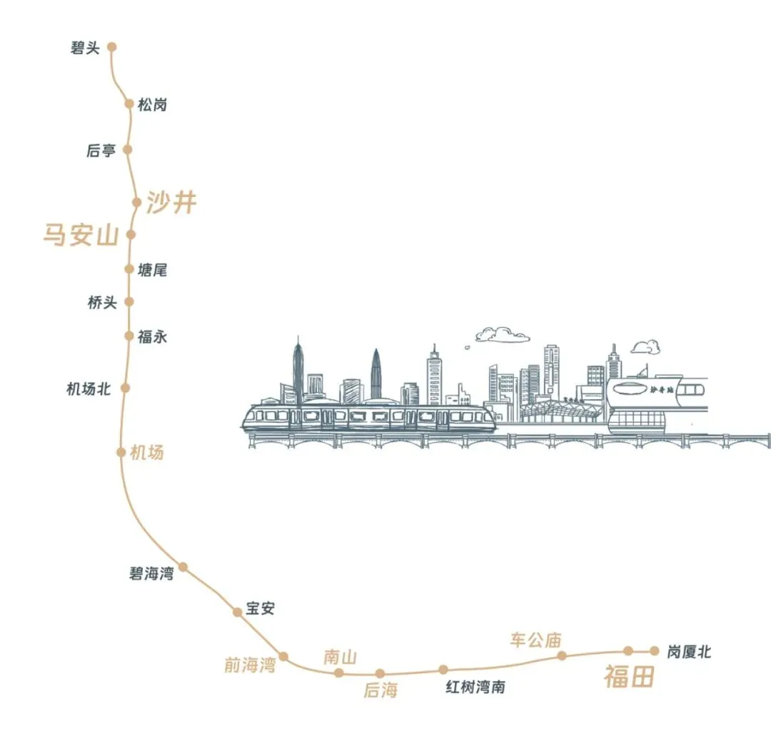 紧邻11号快线沙井站约700米,5站到机场,7站通宝安中心(从马安山出发),快速通达前海湾、后海总部基地、深湾总部基地、福田中心。