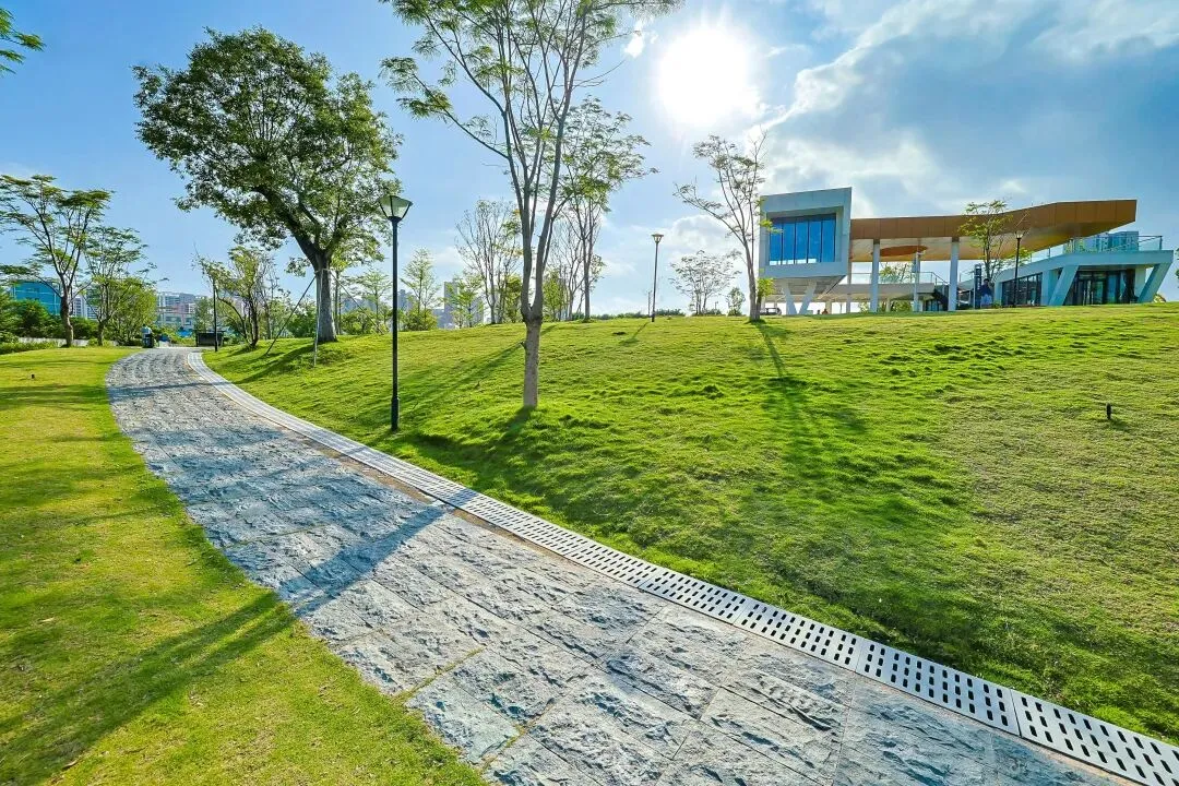 定岗湖公园占地面积约9.5万㎡,2023年荣获“最受市民欢迎奖”,公园包括水域、湿地、亲水平台、音乐喷泉、廊桥、儿童活动场地、足球场等,为周边市民提供了多样的公共活动空间。