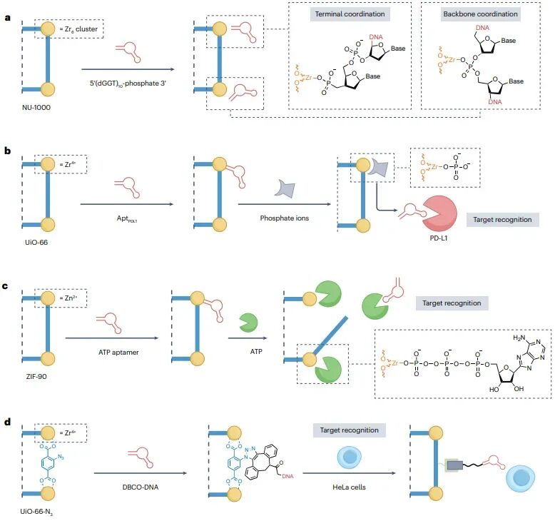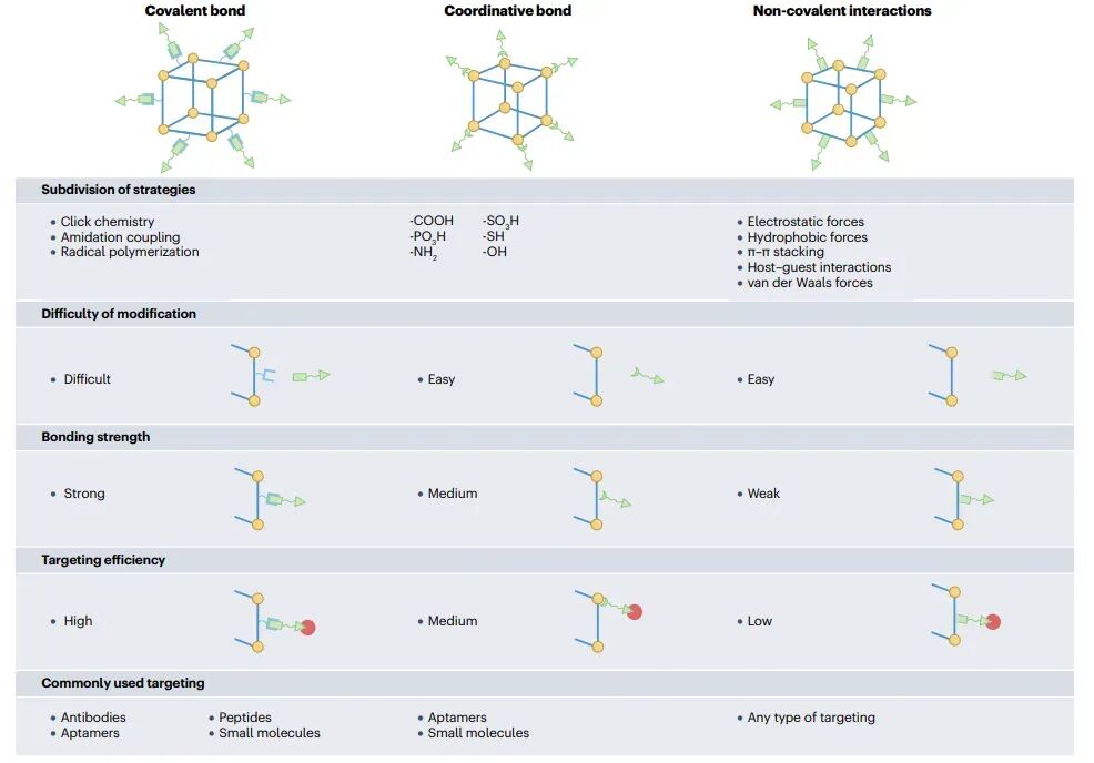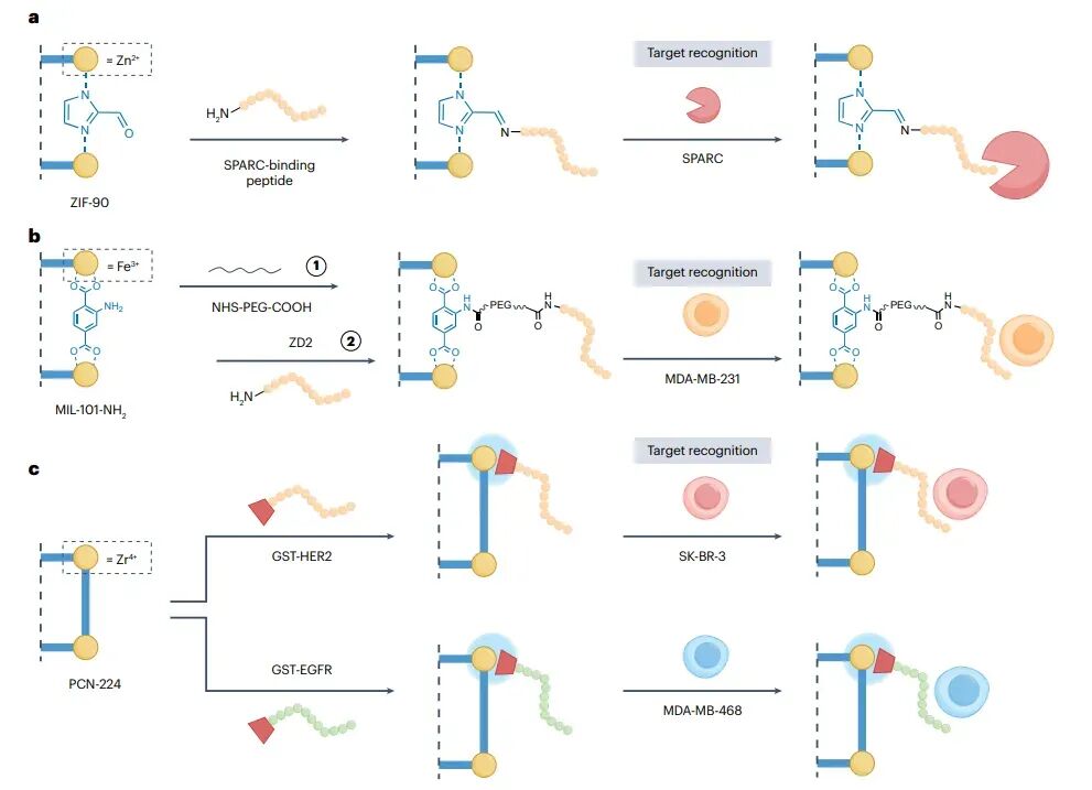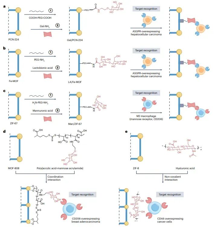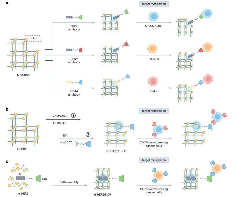 在癌症诊疗领域,“精准诊断”与“靶向治疗”始终是科研人员追逐的核心目标。而金属有机框架(MOFs),这一兼具结构多样性与多功能性的有机-无机多孔杂化材料,凭借其可调控的金属节点与有机配体,成为了连接材料科学与肿瘤精准诊疗的关键桥梁。自2010年起,具有靶向能力的MOFs逐步走入生物医学视野,从被动靶向的EPR效应依赖,到主动靶向的精准分子修饰,MOFs在癌症诊疗中的应用不断升级。深圳大学彭孝军院士、李明乐教授、陈小强教授联合英国巴斯大学Tony D. James教授等人研究团队系统梳理了靶向MOFs的构建策略、应用方向及临床转化挑战,为下一代精准诊疗MOFs的设计提供了全面指南。相关内容以“Enhancing the targeting ability of metal–organic frameworks in cancer therapy and diagnosis”为题发表在《Nature Reviews Chemistry》。传统纳米药物依赖的增强渗透滞留(EPR)效应,在人体实体肿瘤中表现远不如小动物模型,纳米颗粒向人体肿瘤组织的递送效率极低,成为临床转化的一大瓶颈。而MOFs的出现打破了这一僵局:其丰富的金属节点和有机配体为表面功能化修饰提供了天然平台,通过引入靶向分子实现主动靶向识别,既能增强MOFs在病变区域的滞留、强化与靶细胞的特异性相互作用,又能最大限度减少与健康组织的非特异性结合,大幅提升诊疗效率。截至目前,已有两款非靶向MOF平台(RiMO-301、RiMO-401)进入临床试验,用于放疗增敏和免疫治疗,虽仍依赖瘤内注射,但为靶向MOFs的临床探索奠定了基础。而基于MOFs构建的体外癌症诊断平台,因规避了体内循环、代谢等复杂问题,展现出更高的临床转化潜力。要让MOFs拥有精准的“肿瘤识别能力”,核心在于通过表面工程策略引入靶向分子,目前主流的构建策略主要分为三类,各有优劣、各适其用,科研人员可根据需求灵活选择。基于范德华力、静电作用、π-π堆叠、氢键等弱相互作用实现靶向分子与MOFs的结合,最大优势是制备简便、能保留MOFs母体结构,适用于各类靶向分子的表面修饰。但短板也十分明显:结合力弱、修饰效率低,在复杂生理环境(pH、温度、离子、蛋白质干扰)中易发生解离,导致MOFs结构破坏和靶向分子脱落,限制了实际应用。通过点击化学、酰胺化、酯化等反应,让靶向分子与MOFs配体上的官能团(-NH₂、-COOH、-N₃等)形成共价键,是目前稳定性最高的修饰策略。共价键不仅提升了结合强度,还能精准调控靶向分子的排列和密度,让MOFs的表面修饰更具可控性和可预测性,尤其适用于抗体、适体等对靶向精度要求高的分子修饰,靶向效率显著优于其他策略,但修饰过程相对复杂。利用靶向分子上的亲核官能团(-PO₄³⁻、-SH、-COOH、咪唑等)与MOFs不饱和金属簇形成配位键,实现靶向分子的固定。相比共价键修饰,配位键策略无需偶联剂或连接子,可直接合成,操作更简便,结合强度和靶向效率处于中等水平,是适体、小分子等靶向分子修饰的优选方案。通过非共价、共价、配位作用将抗体、肽段、适体等靶向基团偶联于MOFs表面,构建可用于癌症精准诊断和靶向治疗的生物纳米偶联物。图2:金属有机框架的表面功能化策略。共价键、配位键、非共价相互作用三种修饰策略的示意图及特性对比在确定修饰策略后,选择合适的靶向分子是关键。综述中重点总结了六大类经典靶向分子与MOFs的结合应用,覆盖抗体、肽段、适体、糖类、细胞膜及其他小分子,每一类都有其独特的“靶向优势”。抗体凭借高特异性、长血清半衰期和高亲和力,成为最早被探索的靶向识别元件。完整抗体或抗原结合片段可通过共价/非共价策略偶联于MOFs表面,精准识别肿瘤细胞表面过表达的抗原(如EGFR、HER2、CD44)。更惊艳的是,抗体不仅能实现靶向,还能赋予MOFs治疗功能:如抗CD47抗体修饰的Hf-DBPMOF,可阻断肿瘤细胞的“别吃我”信号,恢复巨噬细胞吞噬功能,结合抗PD-L1实现肿瘤免疫治疗;定向组装的抗体修饰MOFs,还能解决抗体取向混乱问题,大幅降低体内脱靶效应。通过不同策略实现抗体与MOFs的偶联,实现对不同肿瘤细胞的精准靶向肽段通过特定氨基酸序列和空间构象识别肿瘤表面标志物,相比抗体更易合成、成本更低,噬菌体展示和固相肽合成技术的发展,让更多肿瘤靶向肽段被发掘(如RGD、ZD2、细胞穿膜肽CPP)。RGD肽段作为经典代表,可特异性结合肿瘤细胞和新生血管内皮细胞上的αvβ3整合素,其修饰的MOFs在肿瘤靶向递送和光热治疗中表现优异,部分已接近临床验证阶段;而细胞穿膜肽修饰的MOFs,还能显著提升细胞摄取效率,促进内体逃逸。通过动态共价键、PEG偶联等策略实现肽段与MOFs结合,用于肿瘤诊断和治疗适体是具有序列特异性的单链核酸(DNA/RNA),可折叠成独特三维结构,模拟抗体实现靶分子的选择性结合,还兼具分子量小、易化学修饰、免疫原性低等优势。因核酸富含磷酸基团,易与Zr-MOFs的Zr₆O₈节点形成配位键,适体与MOFs的结合多采用配位策略。如PD-L1适体修饰的MOFs,可同时实现肿瘤靶向和免疫检查点阻断,且无明显全身免疫毒性;ATP适体修饰的MOFs,还能响应肿瘤微环境的ATP,实现药物的智能释放。通过配位键、点击化学等实现适体与MOFs偶联,用于蛋白递送、免疫治疗、生物正交催化等肿瘤细胞表面过表达的糖蛋白受体,为糖类靶向分子提供了天然靶点。单糖/二糖多通过共价键修饰于MOFs表面,多糖则以配位/非共价作用结合,其中半乳糖、乳糖酸因能靶向肝