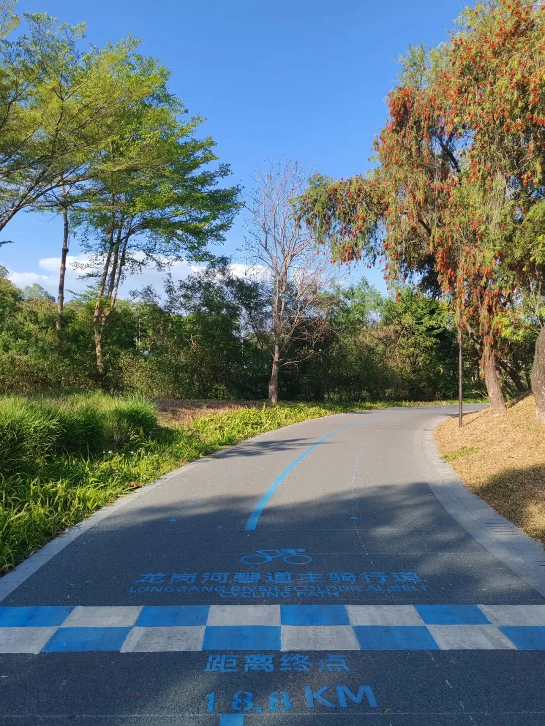 ——地面标识着“龙岗河碧道主骑行道,距离终点18.8公里”。