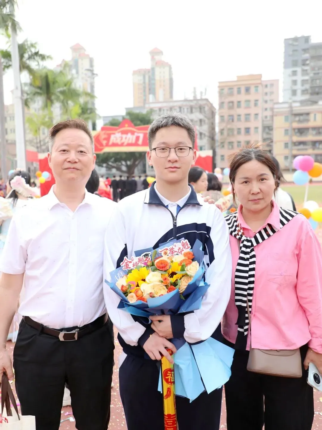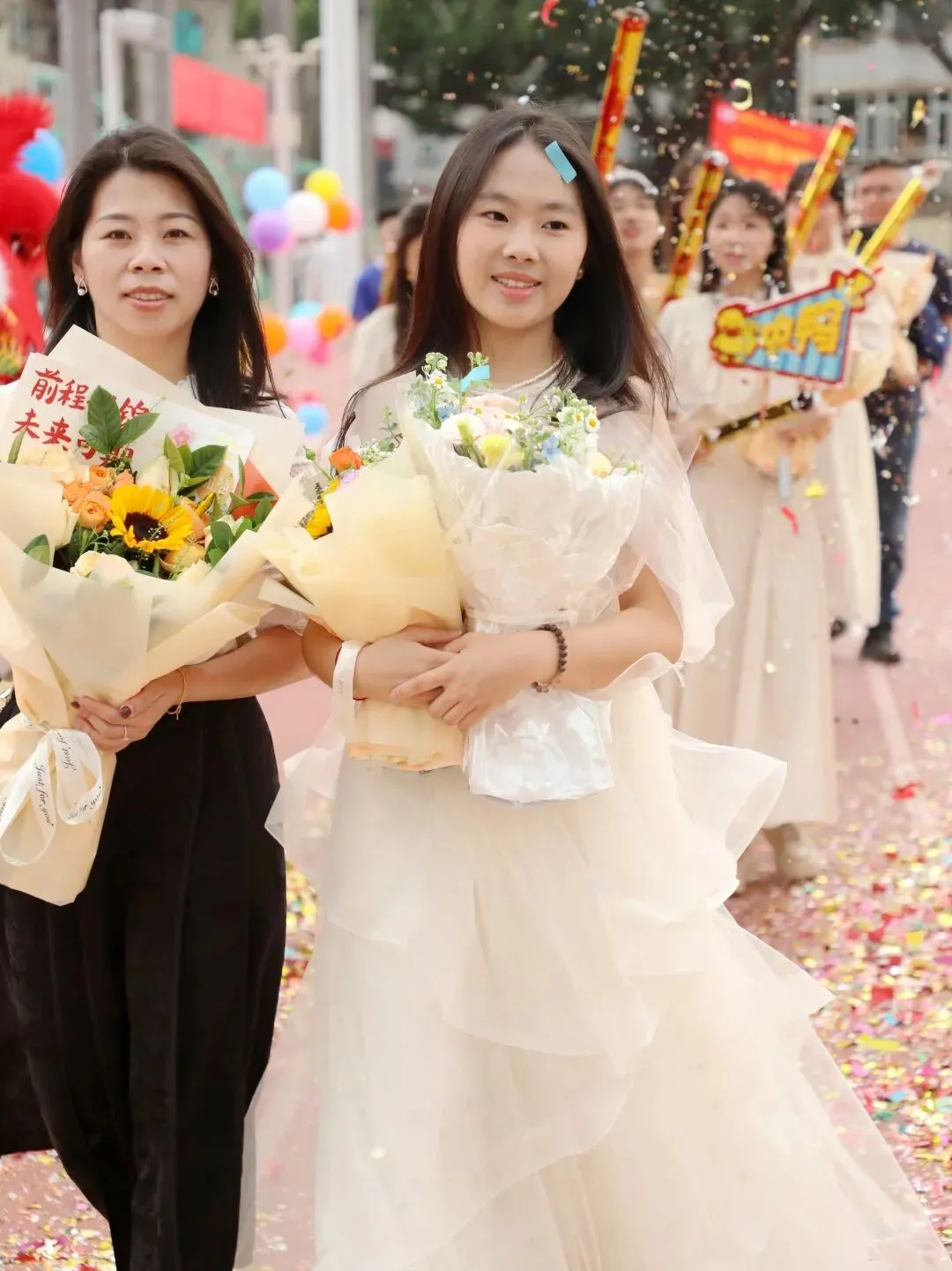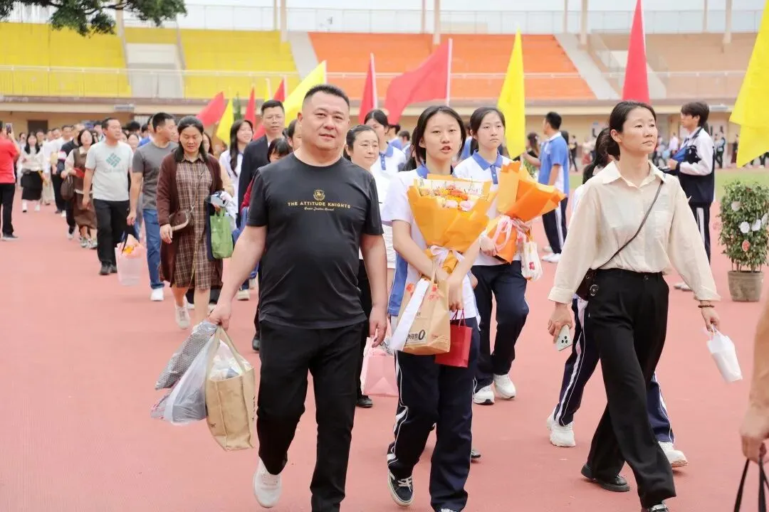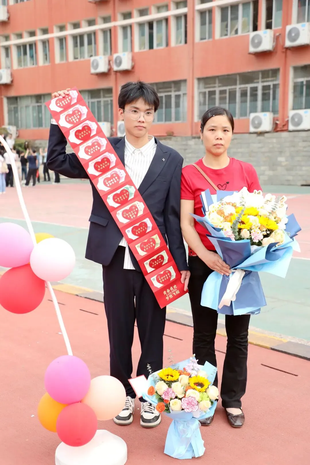 学校运动场上,青春与祝福温情交融。沉甸甸的祝福树上挂满殷切期许,高一、高二学子挥动金旗,接力传递诚挚祝愿;家长们手捧精心准备的鲜花,以爱为礼,见证成长。学子们携手并肩,穿越“时空长廊”,昂首迈向天健楼主会场,共赴这场庄严的成人之约。
