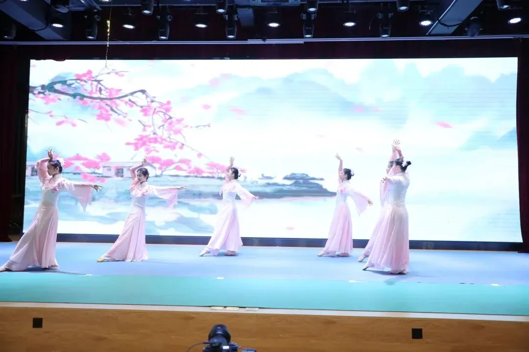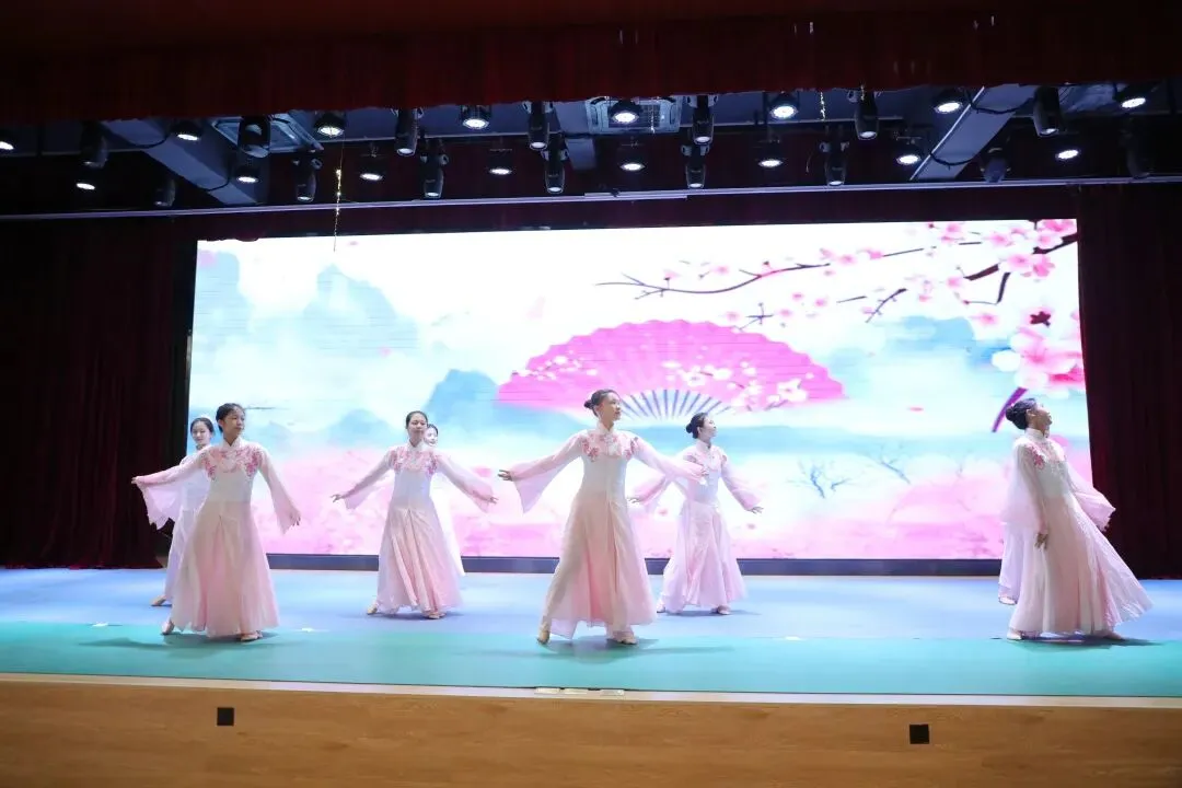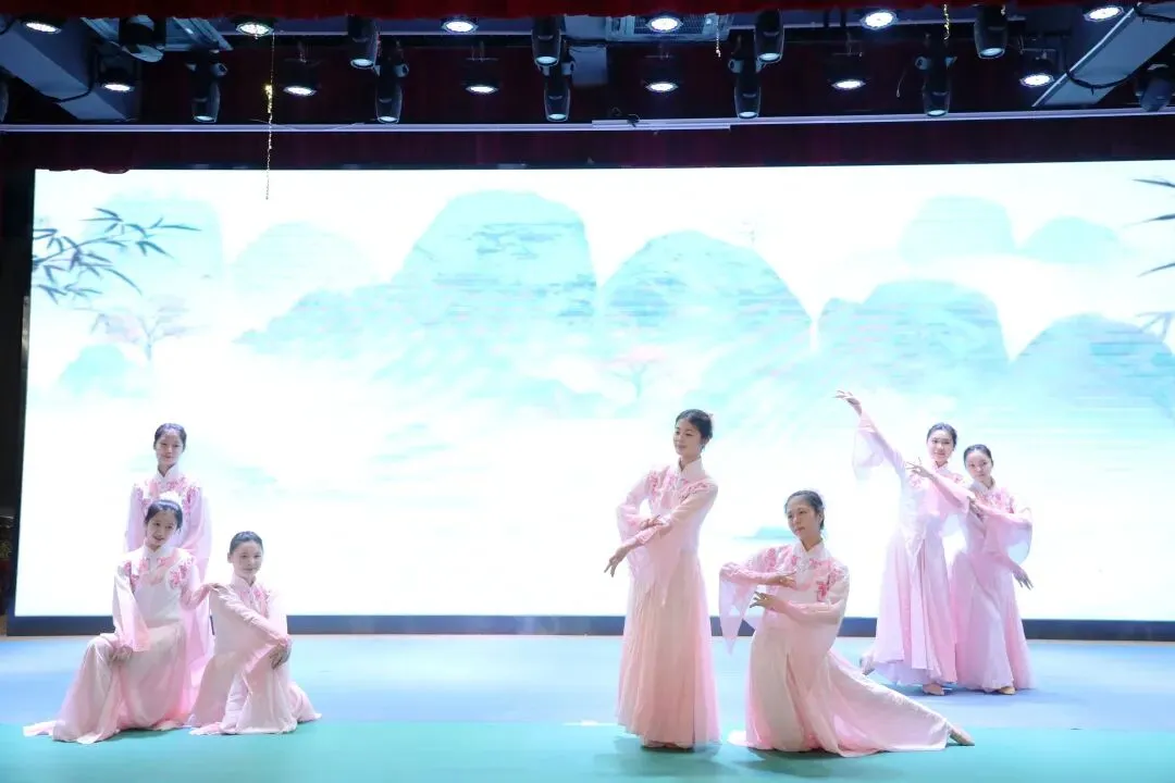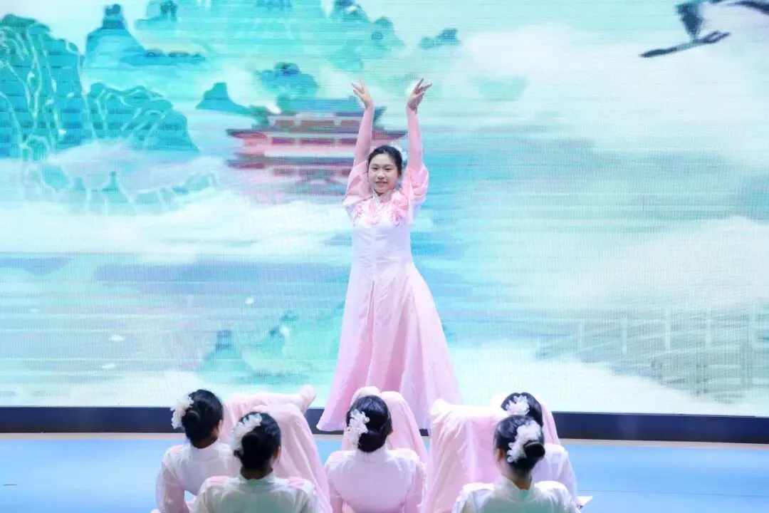 高一、高二学生联袂献上舞蹈《韶光漫》。舞姿轻盈柔美,舒展灵动,尽展青春韶华的绚烂多姿,也为这场成人典礼献上了温柔而真挚的祝福。