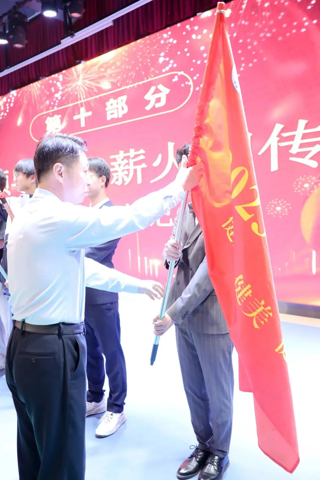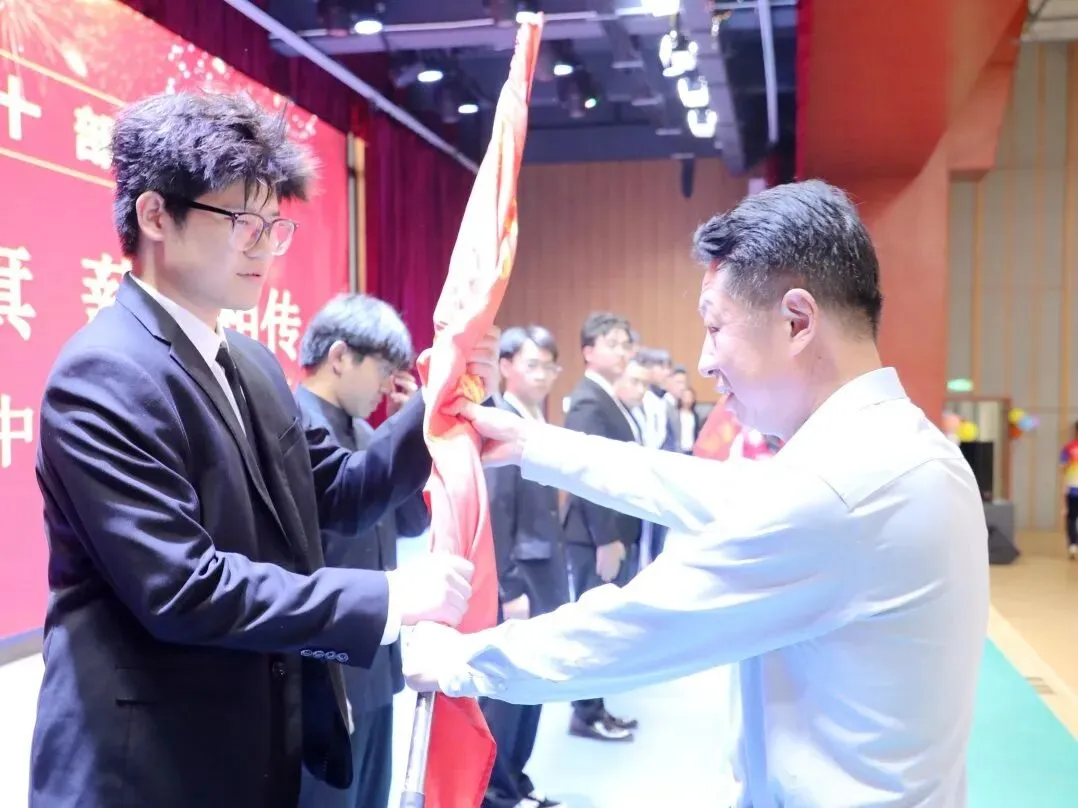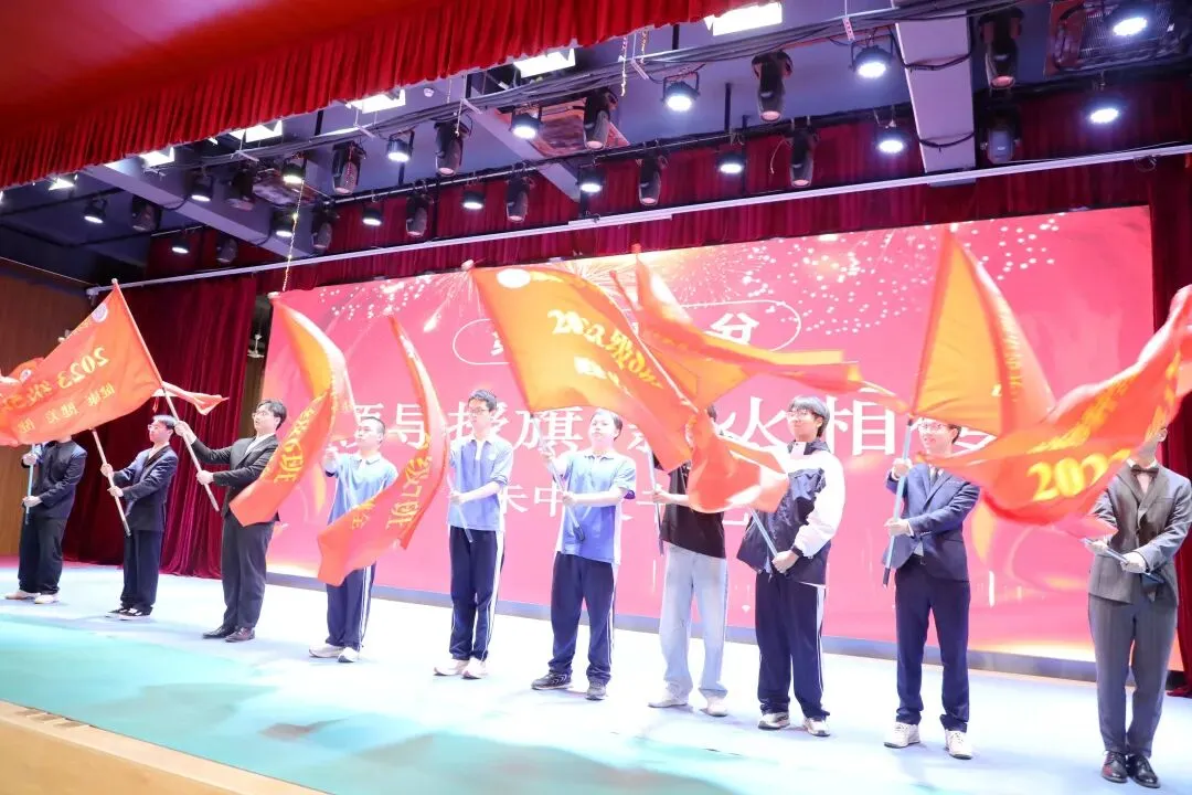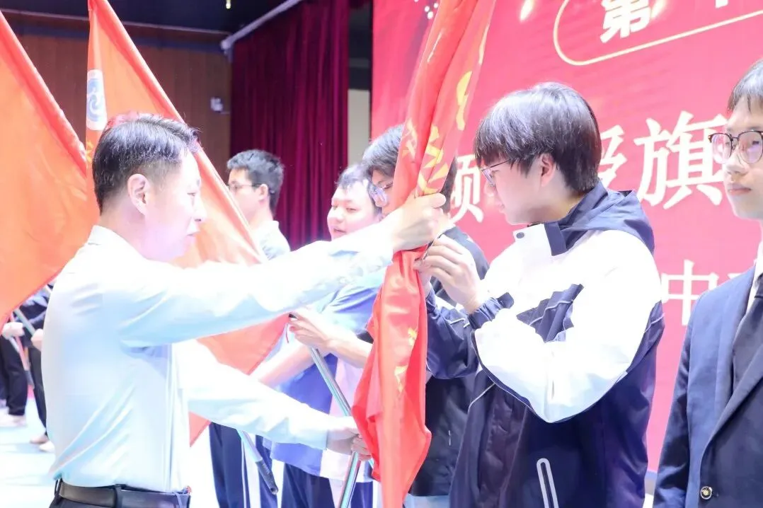 高三年级各班代表踏着铿锵步伐护送12面班旗至主席台。学校党委书记朱中友逐一授旗,猎猎班旗凝聚集体荣誉感,点燃班级冲锋斗志。