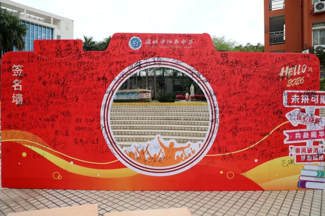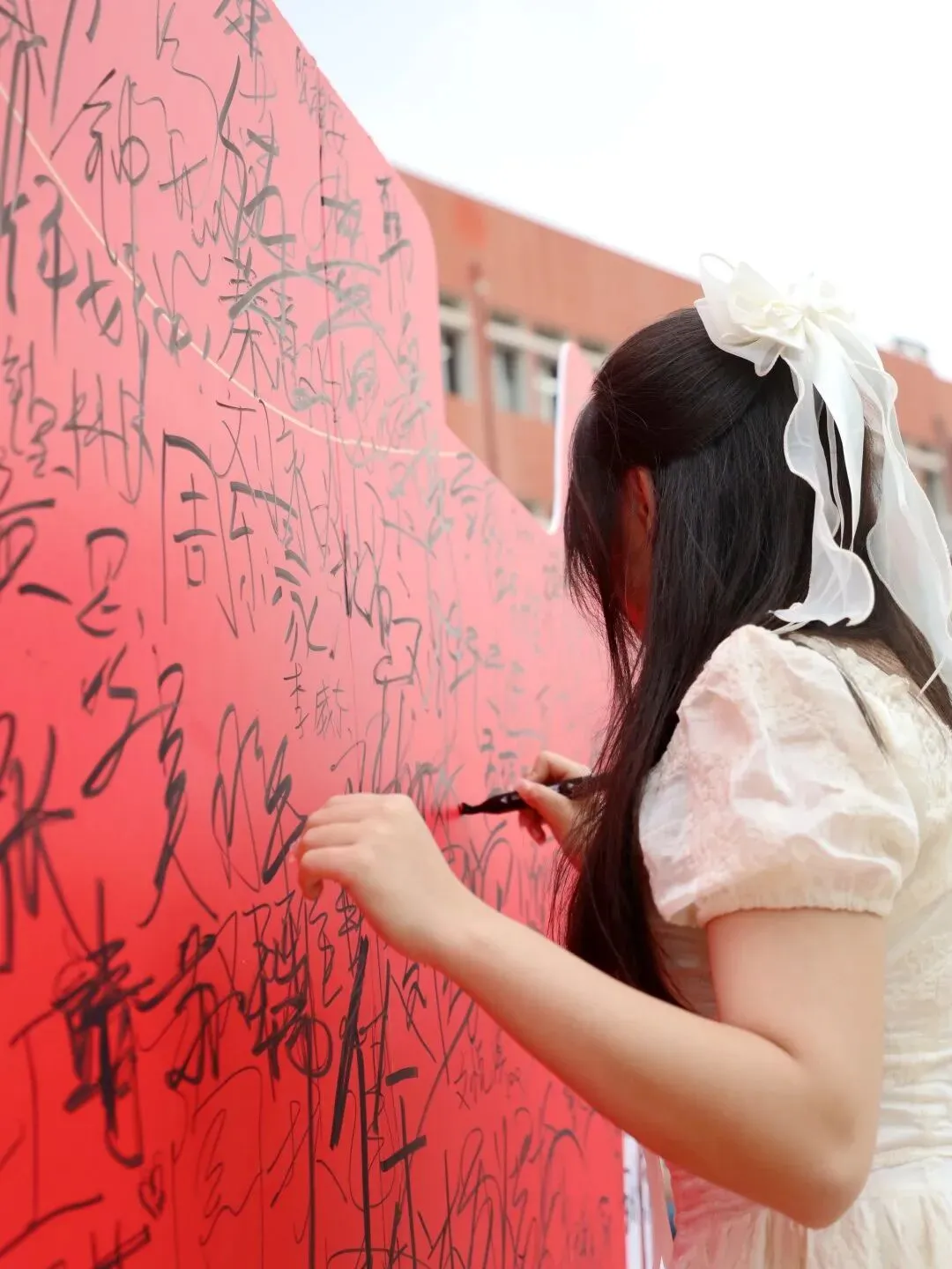 在签名墙前,家长与学生共同执笔,郑重写下姓名与寄语。镜头定格在亲子并肩的身影与灿烂的笑容温暖映照。这面承载着祝福与期待的签名墙,将成为学生成长路上滋养心灵、传递正能量的温暖印记,给予他们自信,迈向新征程。