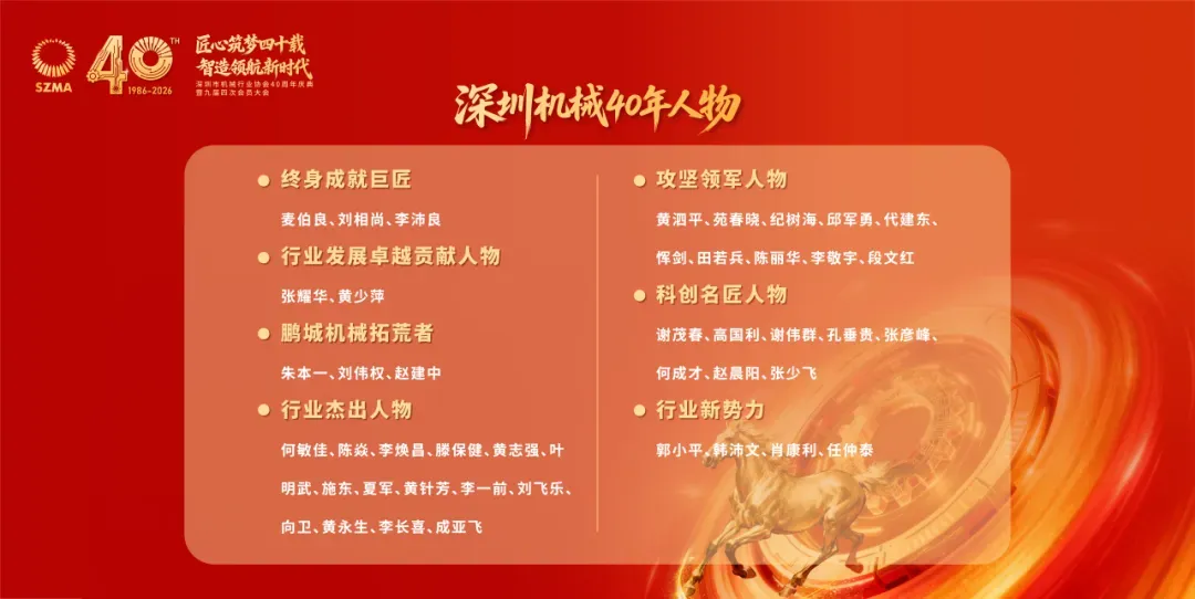 3月20日,“匠心筑梦四十载,智造领航新时代——深圳市机械行业协会40周年庆典暨九届四次会员大会”在深圳举行。来自深圳市机械行业协会的会员企业代表与会。大会举行了分论坛和九届十四次会长会议暨会长团队2026新春团拜会,发布了深圳市机械行业协会新口号,并举行了颁奖典礼。40多位扎根深圳发展的企业家及行业先锋分别获得了深圳机械40年人物“终身成就巨匠”、“行业发展卓越贡献人物”、“鹏城机械拓荒者”、“行业杰出人物”、“攻坚领军人物”、“科创名匠人物”、“行业新势力”荣誉。力劲集团创始人刘相尚先生荣获“深圳机械40年终身成就巨匠”殊荣。