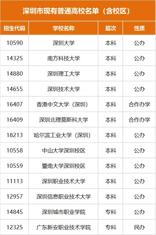 截至目前,深圳共有普通高校或校区13所(本科11所、专科2所)。