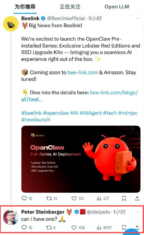 安卓微旗下Beelink、零刻品牌深受全球消费者青睐,OpenClaw创始人彼得·斯坦伯格更是公开留言,希望获得一台Beelink设备,印证了深圳龙虾盒子在全球的独特地位。