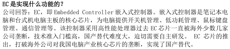 2022年5月,其第一代国产EC芯片CSC2E101在Computex台北国际电脑展首发亮相,成为国内首款服务商用级PC市场的32位高性能EC芯片。