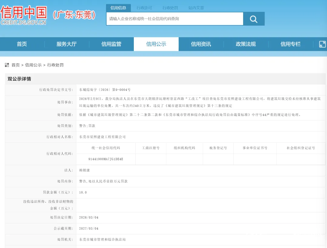 近日,东莞市城市管理和综合执法局在信用中国(广东·东莞)通报了几起关于违规处置建筑垃圾的处罚。其中,东莞市星照建设工程有限公司将建筑垃圾交给未经核准从事建筑垃圾运输的单位处置,被处以10万元罚款。
