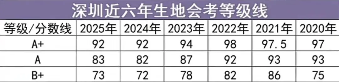 2020-2025年深圳生地会考A+AB+等级分数一览,冲刺2026年生地A+,请扫码