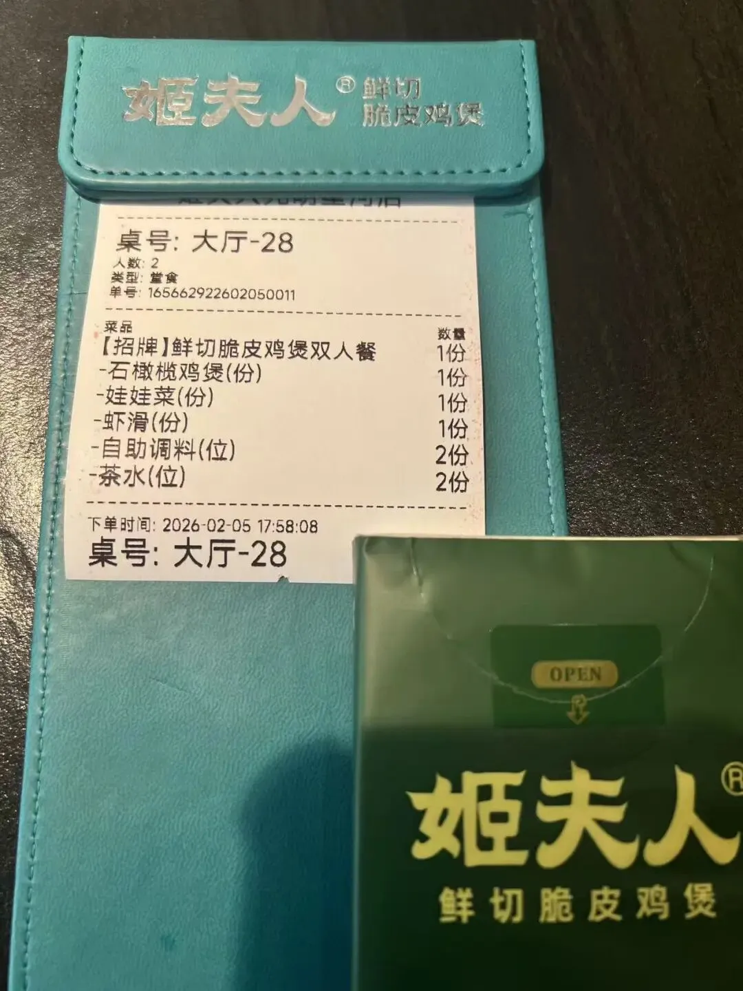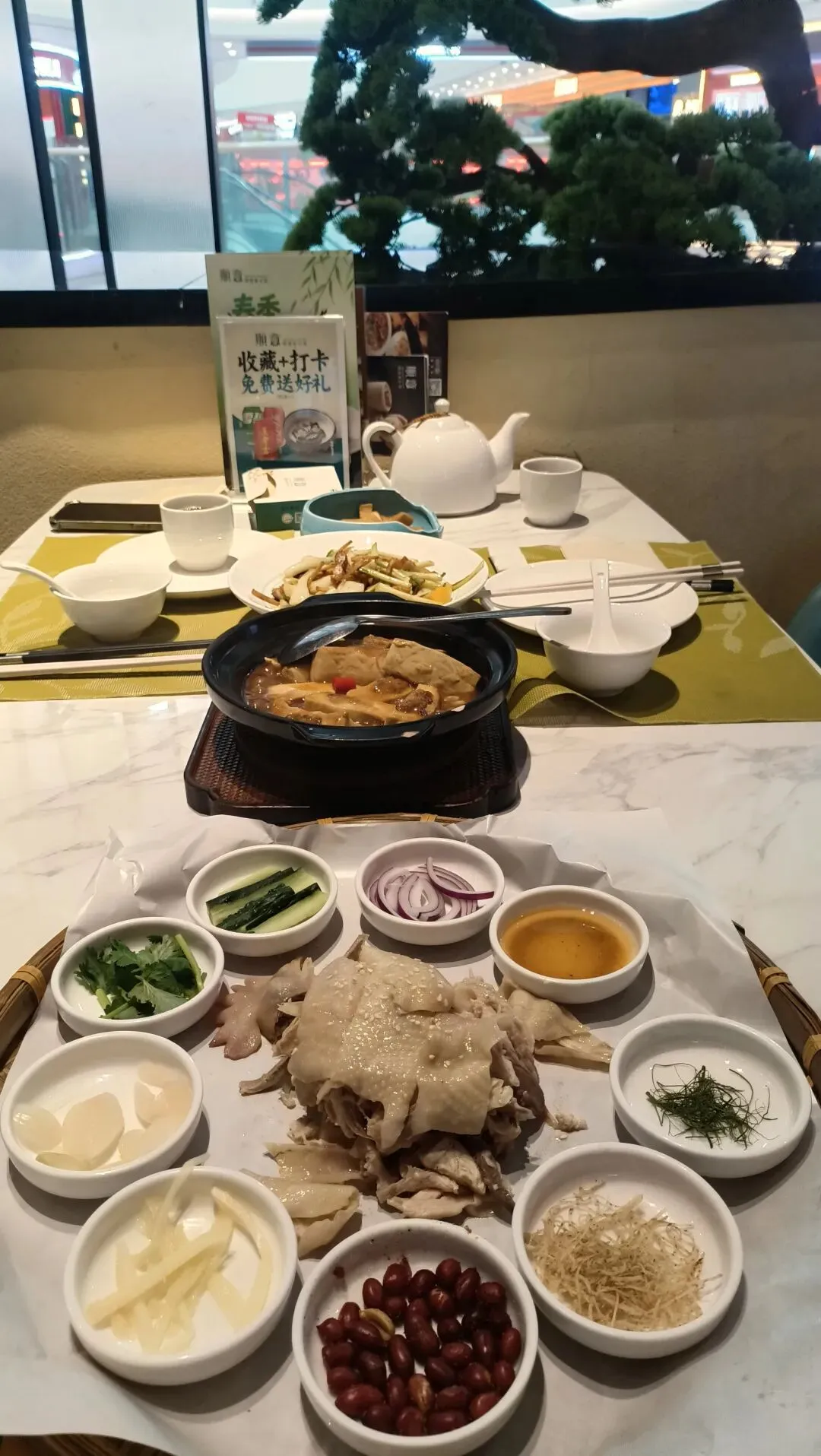我有事,他们父子俩吃二人套餐刚刚好。儿子说味道一般,他老爸更喜欢吃。 特色:养生药膳鸡煲,主打现切脆皮鸡。明档现切去骨,鸡皮薄脆,肉质紧实不柴。