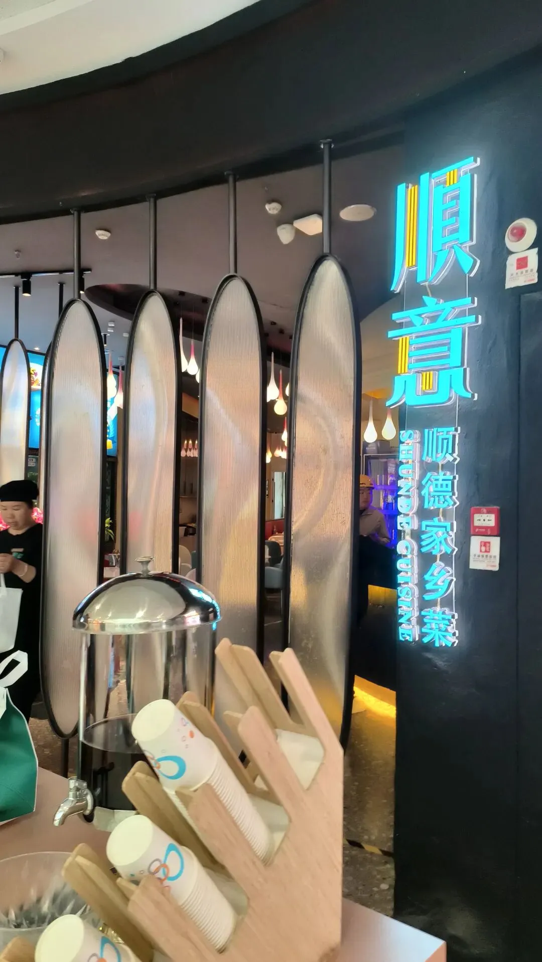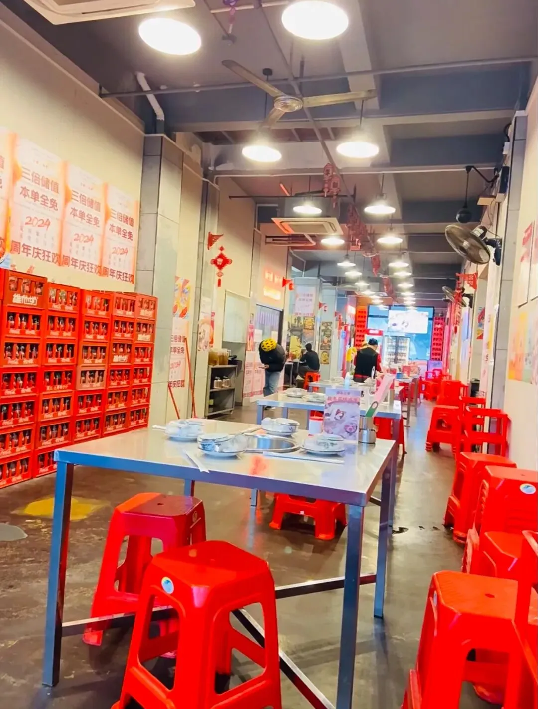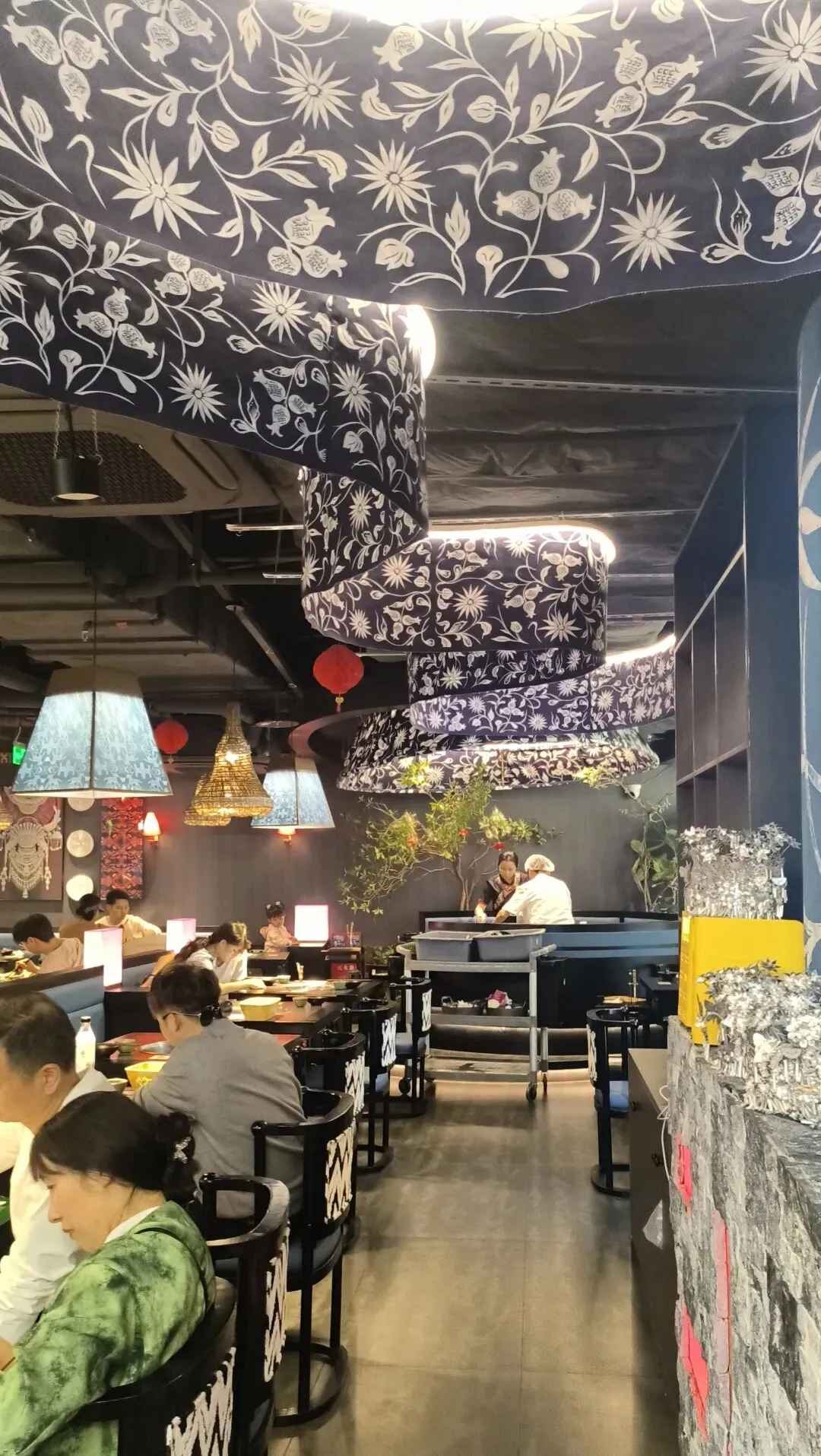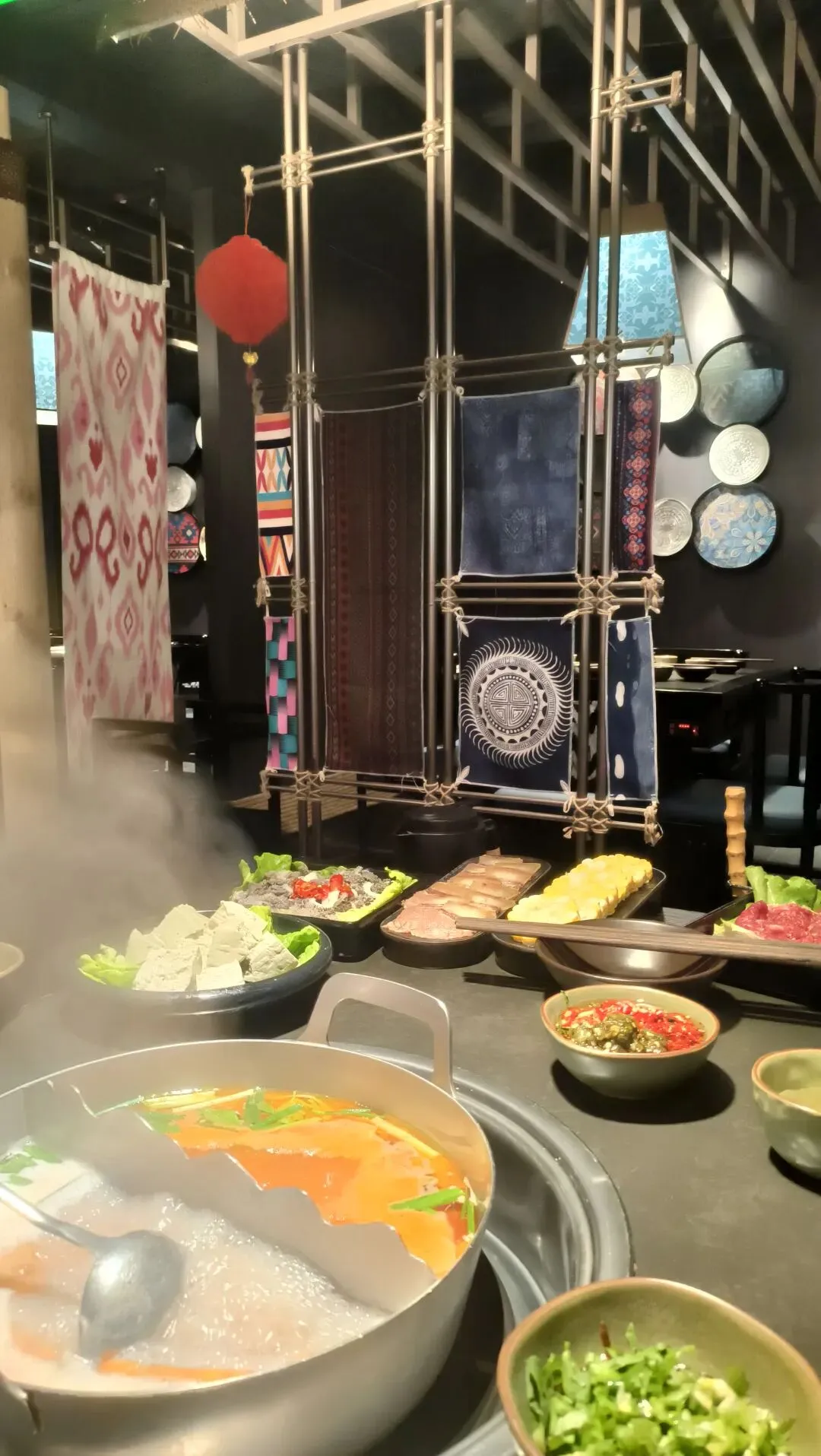 没有装修,大排档风格,就在旧糖厂文创园里,门口挂着大红灯笼,很好找。 营业时间:11:00-14:00,17:00-凌晨3:00 喜欢苗族蜡染风:天花板大面积蓝白蜡染布、苗银装饰、竹编吊灯,民族风浓郁。