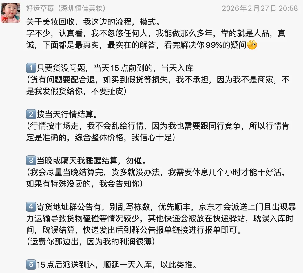 1.稳定的价格:团队身临一线,亲自操盘卖货,纯一手价,绝不虚标,表格标多少回多少,不存在到货刀。3.不轻易拉闸休息:只要不是不可抗力因素,我们不休息,每天都上班收货卖货,团队最强记录连续上班2个月,没有一天休息,不会耽误大家的回款,更重要的是不会耽误行情。4.优质服务:无论大户,散户均享受一样的服务态度,只要你带着友善态度交流,哪怕你只有一根cpb长管,一盒拍立得相纸,都会帮你安排到位,不存在你货量小就爱答不理,每一个大牛都是从小白成长起来的。5.一站式回收:只要是我们回收的,无论是手机,数码,美妆,港药等均往同一仓库,无需分开寄往不同仓库,省心省事省运费。6.售后取证无忧:工作人员在拆货,入库之时,如果发现商品有磕碰,会拍照取证,并全程协助处理。7.信息回复及时:我们保证绝不会你的货签收之后,长时间不回复信息,只要闲下来,一定会挨个清理信息,如有急事,请弹语音。8.免费提供高质量人工筛选线报:综合市场需求给大家发线报,做到互利共赢。深圳恒佳出货客户的真实反馈不会说谎,妈妈再也不用担心我被收货佬坑啦~