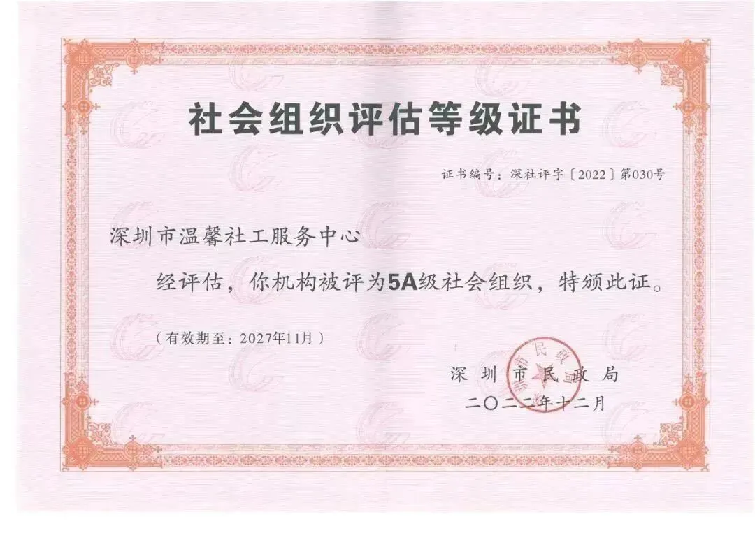 机构运作规范,屡获社会肯定,机构党支部荣获先进基层党支部。机构先后获全国百强社会工作服务机构、民政部首批“全国企业社工试点单位”、广东省最美禁毒团队、“深圳市优秀社工服务机构”、深圳市“5A级社会组织”、深圳市“十佳公益机构”、深圳市“禁毒工作特别贡献集体”、深圳市牵手计划特殊贡献奖、深圳市巾帼文明岗、深圳市社会工作服务机构绩效评估“A”级等荣誉称号,获国家、省、市、区级各类奖项上百个。