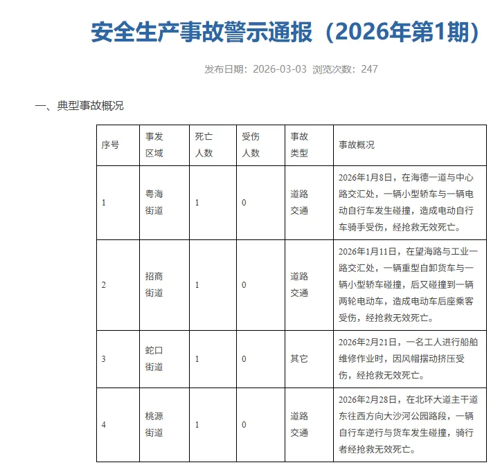 2026年1月11日,在望海路与工业一路交汇处,一辆重型自卸货车与一辆小型轿车碰撞,后又碰撞到一辆两轮电动车,造成电动车后座乘客受伤,经抢救无效死亡。