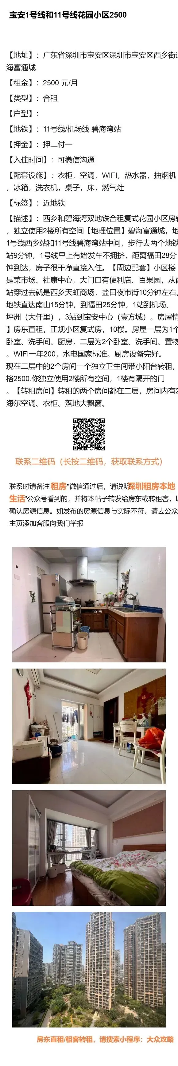 >>> 宝安区 11号线/机场线 碧海湾站 合租2500元/月